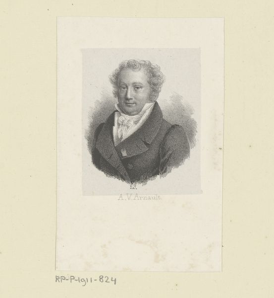 Editor: Here we have an engraving titled "Portret van Antoine-Vincent Arnault" dating sometime between 1811 and 1871, created by Pierre Pelée. It’s quite a formal portrait, almost severe. The detail in the face is incredible, but the background is rather plain. What catches your eye when you look at this work? Curator: It's intriguing, isn't it? This portrait, etched in monochrome, whispers tales of Neoclassical ideals and the rise of Romantic sentiment. Notice the subject's slightly dishevelled hair, defying the strict composure typical of Neoclassical portraiture. He's a thinker, perhaps a poet wrestling with grand ideas. The medium, engraving, allows for incredibly fine lines. What impression do you get from his eyes? Editor: He looks a little world-weary, maybe? The eyes suggest a depth of experience that doesn’t quite fit with the rather formal pose. Curator: Precisely. The artist, Pelée, captures a moment of inner reflection within the framework of societal expectations. Consider the cultural context; Europe was in constant flux. Does knowing that the work was done during that era change your perception? Editor: It does! The tension between the formal presentation and the subject's inner life suddenly becomes more pronounced, like he's caught between two worlds. Curator: Exactly! It's a dance between control and vulnerability, rendered in exquisite detail. A little glimpse into a soul. It’s why I always feel strangely connected to images. The little details carry all the secrets, I believe. What do you make of it now? Editor: I'm seeing so much more now, it's almost like the picture itself came alive. The context really does inform the content. Thanks so much! Curator: My pleasure. Keep looking. You will keep seeing.