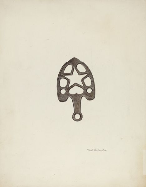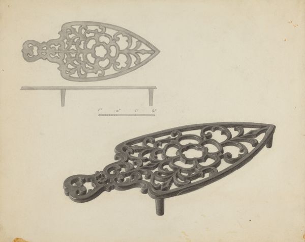 Curator: Immediately I’m struck by the intense density, considering it’s a pencil drawing. Editor: It is interesting how Mildred Ford rendered this ordinary object, dating it to around 1937, titled simply "Flat Iron Holder." I wonder what drew her to it. Curator: It possesses such totemic presence, more than its function would suggest. Look at the details embedded within its form. The radiating sun motif—evoking warmth, certainly—but also suggesting power and domesticity entwined. Even the circular swirls suggest a sort of containment. Editor: Absolutely, and it begs the question of craft versus utility. Was this an object celebrated in its own time for its decorative qualities? Or was Ford perhaps reflecting on the lives intertwined with its function - women and labor? The materiality is intriguing - the dark pencil lines rendering the potential cast iron of the piece. What was the work it had seen? The material of the holder hints at mass production, at necessity made aesthetically appealing. Curator: I think the sunburst transforms something utilitarian into an emblem of domestic artistry. The implement may suggest work, yes, but this piece captures the quiet dignity of everyday tasks and transforms the labor into an offering through symbolic craft. Editor: An offering... perhaps. It seems more about the practical application of labor and division of work to me. By showing us every scratch, every curve, every possible imperfection, Mildred Ford reminds us that even the lowliest and mundane object contains multitudes when we interrogate how it was manufactured. The social realities can be revealed through examining materiality. Curator: Yet, these patterns feel imbued with ancestral memory too. In viewing such works of practicality, aren’t we tapping into our relationship with lineage itself, in whatever fashion or cultural dynamic? Isn’t that itself an act of remembering our ties? Editor: A stimulating suggestion... Regardless, Mildred Ford offers us much to contemplate with this modest yet powerful work. Curator: Indeed. An evocative reminder that meaning hides in the most commonplace forms.