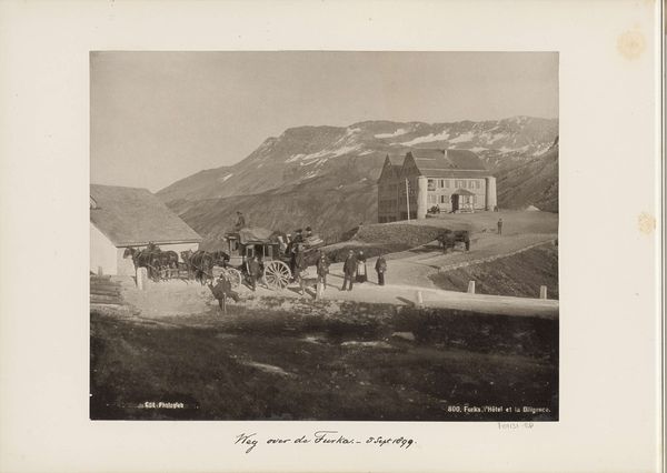 Editor: We're looking at a photograph titled "Kraal met paarden en muilezels in de Dolomieten," or "Corral with Horses and Mules in the Dolomites," taken around 1916. The artist is Henri de Rothschild, and the medium is gelatin silver print. The monochrome tones lend a somewhat somber and weathered feel to this alpine scene. What are your impressions? Curator: You know, I’m struck by the way Rothschild captures the stillness in this landscape. The Dolomites are so imposing, but here, the horses and mules gathered together bring a sense of intimacy and life into that vastness. They're a counterpoint to the almost ghostly mountains in the background. I feel like there’s a story embedded in the image—a hidden narrative about human connection with animals amidst the harshness of nature. Don’t you get that sense too? Editor: I do. It’s interesting how the animals seem so grounded while the mountains almost dissolve into the sky. They are so quiet and almost blend in with each other. Do you think there is more of a hidden symbology than just the animals? Curator: Perhaps it represents a harmony, or even a reliance. Look how these animals depend on one another for warmth, shelter and maybe even the same goes for man's existence in connection to nature, like one big intertwined existence of mountains, buildings and beings. I suppose it also shows a simple story of survival of its kind as well as for its immediate needs to be met by this gathering place. I bet it tells all those narratives at once. Editor: That's beautifully said. The harmony within is not just a visual, but a relational interpretation! It's amazing how much we can glean from what initially seemed like just a landscape with animals. Curator: Indeed. Isn’t that what art’s all about? Finding those hidden pockets of meaning, where nature, humanity, and history meet. I guess Rothschild knew that a picture is worth a thousand words and can transcend different lenses.