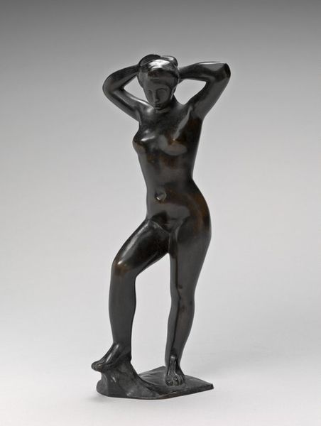 Editor: This is Elie Nadelman's "Standing Female Nude," created in 1908 out of wood, and it’s currently at the Minneapolis Institute of Art. The curves are just mesmerizing. There’s a certain modesty in the figure, but also this undeniable sensuality. What catches your eye when you look at this piece? Curator: I'm immediately drawn to the almost archaic quality embedded within the modern form. The pose, with the hands delicately placed, echoes classical sculptures of Venus, but the stylized curves and simplified features pull it firmly into the early 20th century. Do you sense how the artist plays with cultural memory here? Editor: Absolutely. It's like he’s both referencing and redefining the ideal of the female form. The smoothness of the wood almost gives it a living warmth. Curator: Consider how Nadelman uses wood, a natural material, to create this idealized form. The choice isn't arbitrary. Wood has always been connected to ideas of nature, growth, and the cyclical aspects of life, and these associations bring depth to how we understand her body as more than just a sensual object. It suggests a profound link to primal femininity. Editor: That makes a lot of sense! It’s not just about the nude figure itself, but also about imbuing her with this connection to something larger. Curator: Exactly. And even the small details, the hairstyle, for example, can trigger historical references, echoing styles from ancient Greece, while simultaneously reflecting the contemporary fashions of Nadelman’s time. Editor: So it is the way he re-combines images that make it so impressive. This piece is far more layered than I initially realized. Thank you! Curator: My pleasure! It is a testament to the power of visual symbols to evoke echoes through time, constantly reshaping and renewing our understanding of beauty and being.
