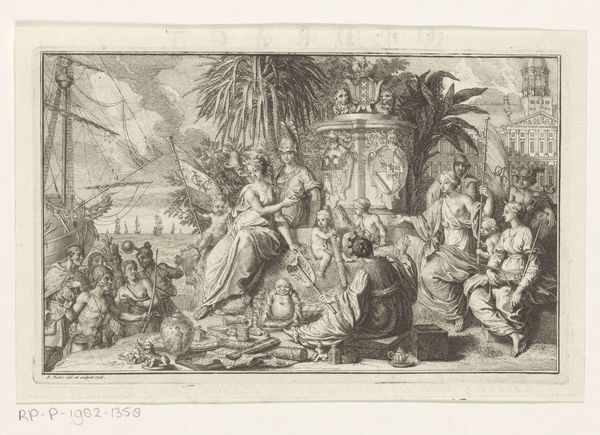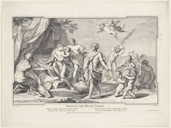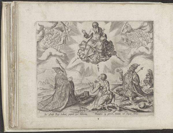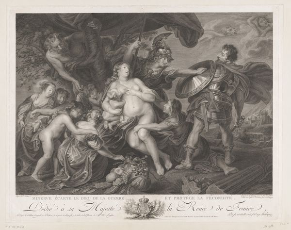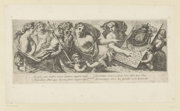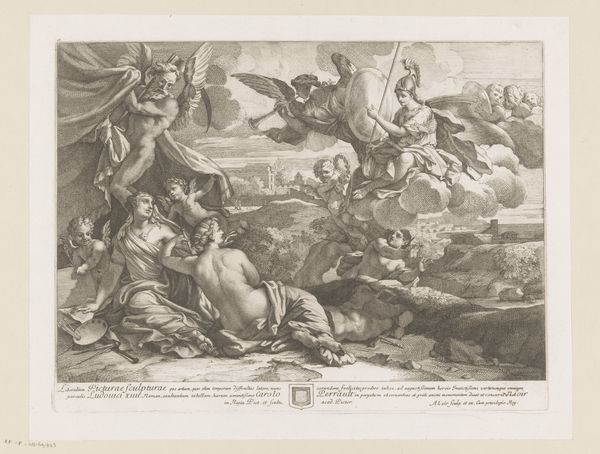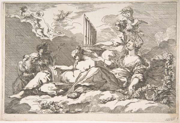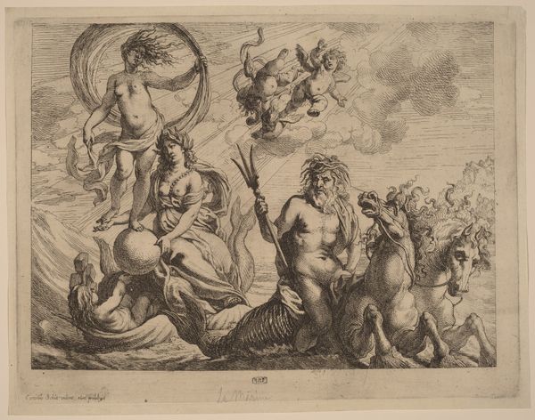 Curator: Pierre Brebiette created this engraving, “Hebzucht (Avaritia) en Vrijgevigheid (Liberalitas),” sometime between 1608 and 1650. Immediately, the stark contrast strikes me; one figure is hunched and grasping, the other upright and open-handed. Editor: Yes, a striking diptych. Visually, there’s such a clear dichotomy here: the shadowy, crowded space on the left compared to the airy openness on the right. The first, with what I’m assuming represents Avarice, it almost looks as if they are desperately trying to contain something that is constantly about to spill over. It looks uncomfortable, right? Curator: Indeed. The figure of Avaritia is consumed by wealth, but she's also imprisoned by it, right? Her gaze is fixed downward, focused solely on accumulation. Snakes for hair! And Liberalitas—Generosity— is elevated on clouds, raining down coins effortlessly with this open expression. These aren't just portraits, right? They are symbolic figures within this established allegorical tradition that served didactic functions at the time. Editor: Didactic yes, and perhaps politically charged? This period in Europe saw dramatic shifts in wealth and class. Print culture became a critical tool for disseminating social and political commentary. Perhaps these figures represent a wider anxiety of social imbalance? A sort of "us" and "them"? How interesting that the snakes in her hair are echoes of Medusa who in current context can be a powerful figure for female rage! Curator: That’s an interesting insight! Snakes have such rich, ambivalent symbolism. In some ways here, they function to remind me of classical concepts: Medusa can protect a treasure. Avarice may have its treasure under tight protection, it still feels sterile and cold to me. Editor: Yes, exactly, it is protective but at the cost of her emotional and intellectual life! Which perhaps also suggests something about the period? Maybe it suggests anxiety about rising power or greed? Brebiette’s engraving is an invitation to engage with a deeply engrained history. Curator: For me it really brings to light the concept of value, what is truly valuable versus what we are conditioned to desire. This work will continue to echo for generations. Editor: It asks us: what does it truly mean to be generous and to give, or to accumulate? Are they mutually exclusive, historically contingent concepts? Brebiette sparks something deeply entrenched and unsettling!