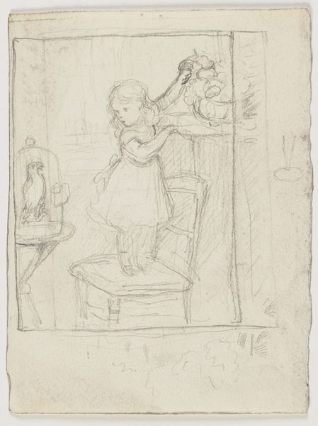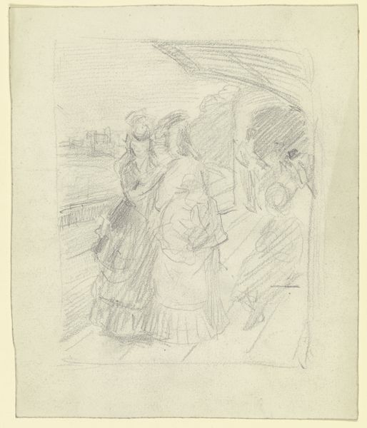 Editor: This drawing by Otto Scholderer, called *Leierkastenmann mit Affe vor Zuschauern*, seems to be a pencil sketch on paper. It has such an interesting composition, with the layering of the audience above the main characters. What do you see in this piece? Curator: Primarily, I observe the dialectical interplay of foreground and background. Notice how the artist employs varied line weights to differentiate between the principal figures—the organ grinder and his monkey—and the observing crowd. The sketchy, almost ethereal quality of the children above creates a fascinating contrast with the more defined lines used for the organ grinder's form. Editor: That’s a great point about the line weights creating the depth. Why do you think he made that decision? Curator: The distribution of light and shadow, though subtle, draws our eye to the performance, framing it almost as a spectacle within a spectacle. Observe, for example, how the shaded areas are deployed strategically to create depth and direct the viewer's gaze. Note the implied shapes too; what seems unfinished or rudimentary adds an intriguing dimension. It prompts the viewer to participate in the completion of the artistic idea. Editor: I never considered the ‘unfinished’ parts adding to the composition. It gives it an interesting texture. Is there something to the shapes created around the human figures too? Curator: Precisely! The negative space functions almost as an active participant in defining the subjects, don't you agree? There’s a compositional balance achieved here through both presence and absence of lines. Also consider how Scholderer, through a rigorous deployment of technique and form, asks us to contemplate not just the ‘what’ of the drawing but also the ‘how’. Editor: This has really given me a fresh outlook on how to interpret simple sketches and the important role of visual components. Thank you! Curator: My pleasure. Approaching the artwork from different analytical points is always rewarding.