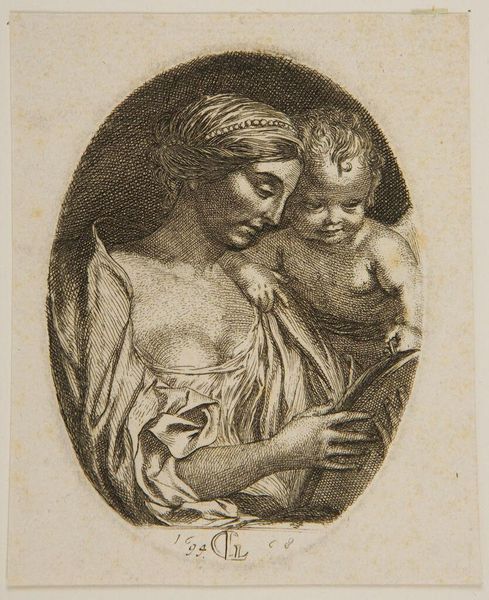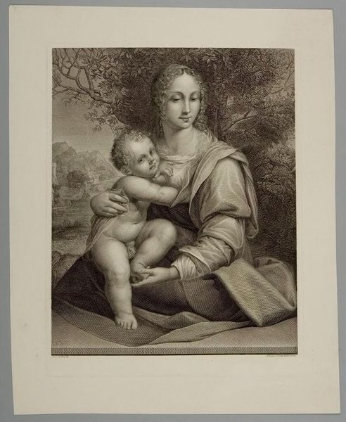 Curator: This is Carl Joseph Alois Agricola’s “Virgin and Child,” currently residing here at the Harvard Art Museums. Editor: It's striking how the radiating lines behind them create this sense of divine light, yet there's a certain melancholy in Mary's downcast gaze. Curator: The composition is strongly reminiscent of Renaissance depictions, particularly those influenced by Raphael, Agricola was likely engaging with those earlier traditions. Editor: Absolutely. But I wonder about the politics of such imagery in Agricola's time. The idealization of motherhood, while seemingly benign, can also be quite restrictive and oppressive. Curator: That’s a crucial point. How do these images function to uphold specific socio-political structures related to gender and power? Editor: Exactly. Examining those contexts helps us understand how these artworks were not simply devotional objects, but also active agents in shaping cultural norms. Curator: Considering its reception and impact through different historical lenses definitely enriches our understanding. Editor: Indeed. It invites us to question the narratives these images perpetuate, prompting a more critical engagement with the artwork.