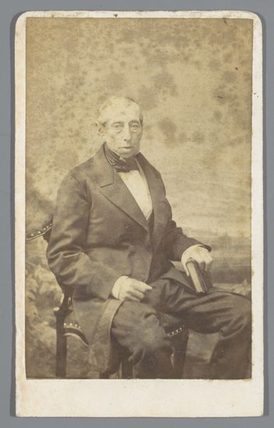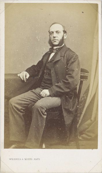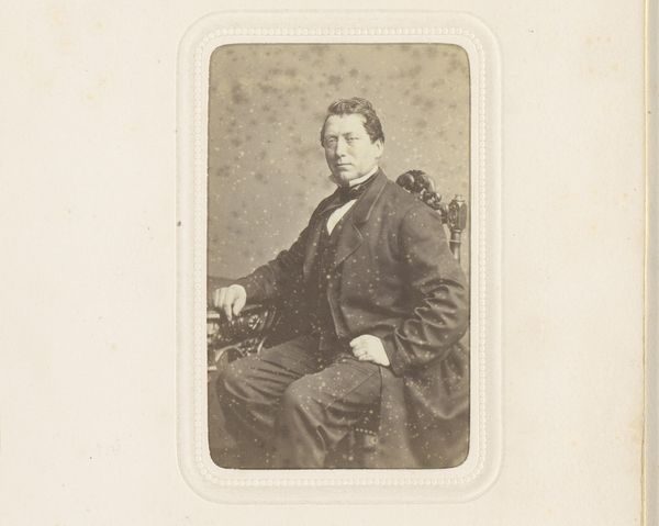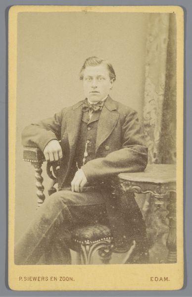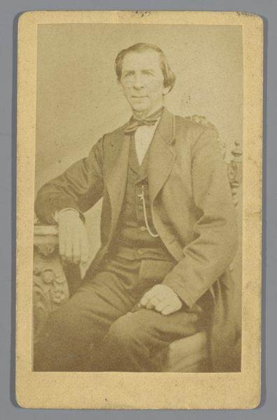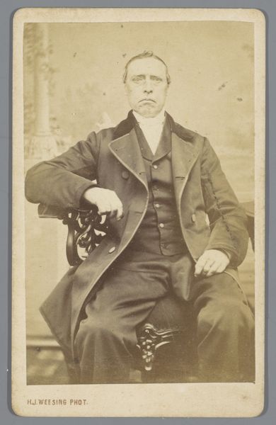 Curator: Oh, there’s something quite haunting about this portrait. Editor: Yes, isn't it fascinating? We're looking at "Portret van een onbekende man," or "Portrait of an Unknown Man," created by Pieter Siewers sometime between 1857 and 1898. It's a gelatin-silver print on paper. The sepia tones lend a melancholy feel. Curator: Absolutely. The tones and the man’s reserved posture – a strange mix of solemnity and vulnerability, as if the camera has stolen a piece of his soul. And to think this image survives; paper, chemicals, time all working together to leave him for us, gazing steadily. What do you make of that heavy woolen coat, from the perspective of production? Editor: The materiality is key. Think of the processes involved! Siewers meticulously coating the paper, exposing the image in the darkroom… Even the specific clothes denote social status, wealth probably connected to some degree of land ownership. Photography itself was a rising commodity, a democratizing technology in that sense. Making portraits more widely accessible, although even obtaining simple paper prints may still have meant financial outlay. Curator: I love that democratizing aspect. For years, portraits were limited to the wealthy, rendered in paint with a flattering eye. This... this is arguably closer to a real person. He's staring directly, almost defiantly. Not idealized. Though I do wonder, did Siewers retouch these? Even early photographs often had that hand-done alteration after the printing process, to subtly refine. Editor: Very possibly so, which muddles the authenticity further, doesn't it? Although such acts also imply how highly this society viewed aesthetic improvements to represent themselves. Still, the relatively raw quality brings us close to the physical, and maybe that offers new ways into seeing history, not through paintings hung on gallery walls so much as printed media accessible to all. And maybe the slight imperfections capture some true qualities the high art excludes? The human flaws they wanted edited or glossed? Curator: Perhaps. It's strange to ponder that he never imagined being scrutinized so intensely centuries later. Does the fact that we don't know his name somehow change the viewing experience? Give the picture a different weight, considering these images and techniques as art. Editor: The anonymity allows projection, doesn't it? He becomes Everyman. We can overlay narratives of labour, loss, change with the industrial era upon his neutral gaze. His unknowability opens possibilities. Curator: A ghost of a man, captured in silver and gelatin. Poignant, really. Editor: Agreed, and a document ripe for understanding labour and consumption within photographic creation.