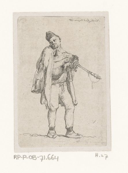 Editor: This is "Standing King with Incense Burner," an etching and engraving made around 1828, now held at the Rijksmuseum. The artist is William Young Ottley. It’s a bit mysterious, isn't it? Almost dreamlike with that sketchy style. What do you make of it? Curator: Dreamlike, yes! It’s got that feel of something remembered, or perhaps imagined, rather than observed. I love how the artist uses line – so spare in places, almost frantic in others. What strikes you about the figure himself? Is he proud? Defeated? Editor: Hmm, I’m not sure… He’s holding that incense burner, but he's got this downtrodden look about him. Like maybe the weight of royalty isn't all it's cracked up to be. Curator: Exactly! Notice how Ottley renders the king’s posture. Slightly stooped, perhaps burdened by his crown and ermine. He’s "standing," but barely. And the setting! It’s more suggested than defined, a backdrop to his inner turmoil. Do you think this is a literal portrait, or something more symbolic? Editor: Good point! Maybe he represents something larger than just one king. Maybe a commentary on power itself? Curator: Precisely! The fleeting quality of the etching medium complements this feeling of ephemerality. Kings rise and fall, empires crumble, and all we are left with is a smoky trace... perhaps captured perfectly here. Editor: It’s fascinating how much is communicated with so few lines. It makes you think. Curator: It does, doesn’t it? It reminds us that art isn't just about what you see, but what you *feel*. Thanks for pointing that out.