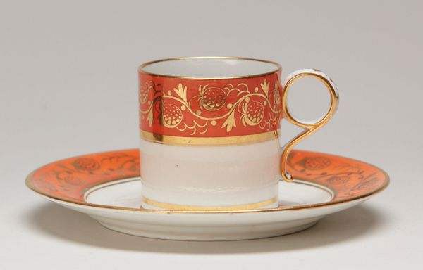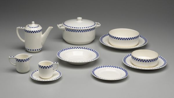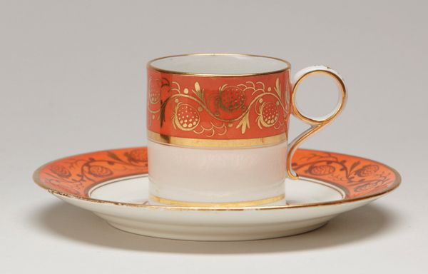 This tea service was crafted by the Worcester Porcelain Works. Notice the dominance of clean, rounded forms, enhanced by the contrast between the pristine white porcelain and the rich, orange-brown decorative bands. This interplay creates a visual rhythm that invites the eye to move around each piece. The strategic placement of ornamentation, confined to horizontal bands, structures the visual field. These bands feature stylized floral motifs, which offer a fascinating glimpse into the cultural codes of the time, where nature-inspired designs were a prominent language. The linear precision of the gold trim further emphasizes the geometry inherent in the forms. What is intriguing here is how the design balances utility and aesthetics, challenging the traditional hierarchy between function and art. It prompts us to reconsider how everyday objects can reflect deeper cultural values and aesthetic aspirations. The service exists as a cultural artifact, reflecting the aesthetic values and social practices of its time.