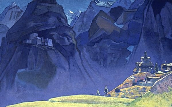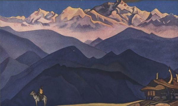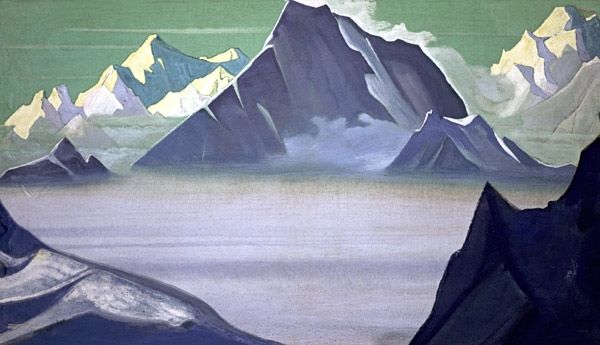 This painting, "Silvery Realm," was created by Nicholas Roerich at an unknown date. The entire vista seems to be cast in shades of blue. It makes me think about the kind of intuitive process you see in artists like Marsden Hartley. Roerich’s paint application is really fascinating here; broad strokes of cool blues and whites build the form of the mountains, which are echoed in the more solid dark mass of the foothills below. Look at the way the light glances off the peaks - almost as if they are made of some translucent material, as if the substance of the mountain is secondary to the effect of the light. I particularly love how the peaks in the distance seem to fade into the sky, blurring the distinction between earth and atmosphere, giving the painting a sense of infinite space and mystery. This feels like a conversation with Symbolist artists like Odilon Redon - who used similar color palettes and blurred edges to create dreamy, otherworldly images. Ultimately, Roerich’s painting resists easy categorization; embracing ambiguity to create an atmosphere of both beauty and uncertainty.