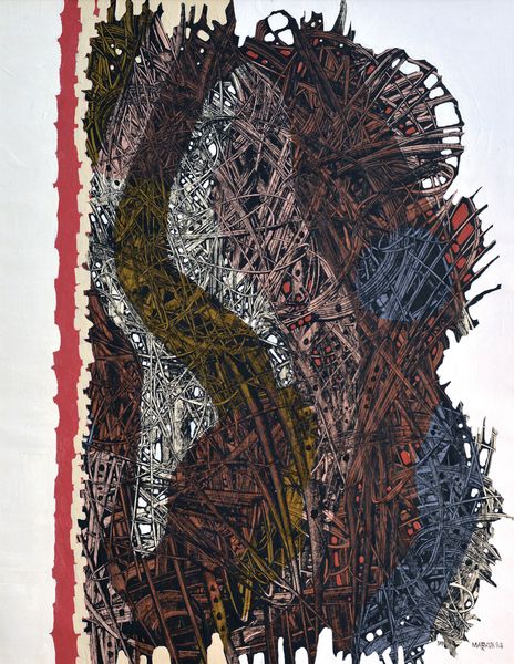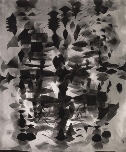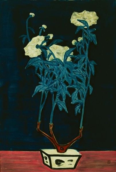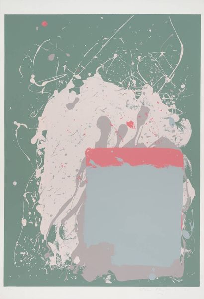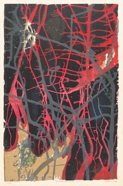 Editor: This untitled piece by Patrick Caulfield features a stylized still life. It feels quite graphic and flat. What strikes you most about the composition? Curator: The interplay between positive and negative space is compelling. The stark contrast between the dark floral arrangement and the lighter background creates a dynamic tension, wouldn't you agree? Note how the artist confines color solely to the interior space of the flower. Editor: Yes, I see that now! The limited color palette really emphasizes the geometric qualities. Thanks for pointing that out! Curator: Indeed. The reductive approach highlights the formal structure, offering a unique perspective on representation.