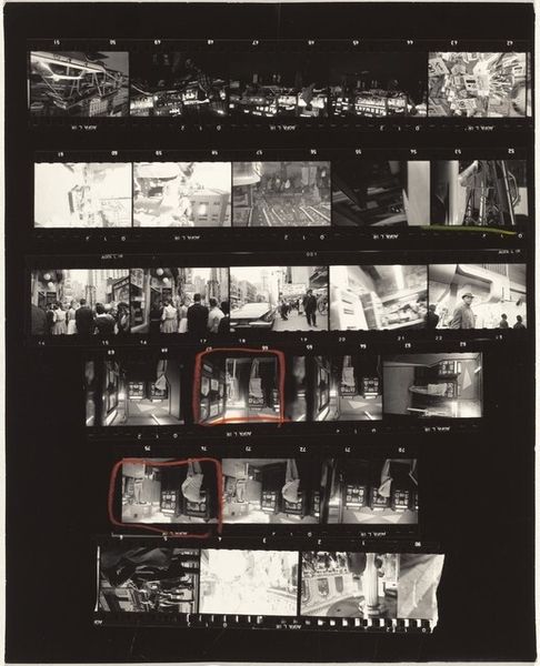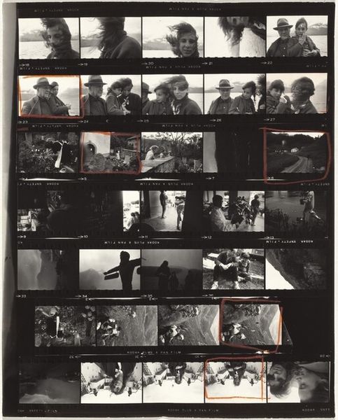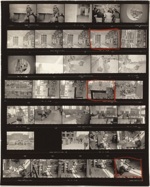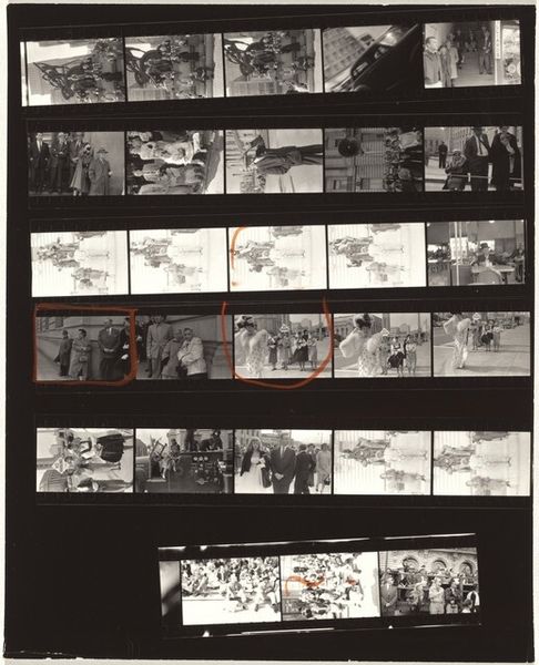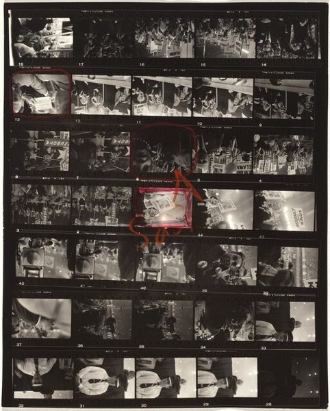 Editor: This is Robert Frank’s “Nixon Campaign 10,” a contact print from 1960. The stark contrast and the gridded layout are so intriguing. It almost feels like looking through a series of fragmented memories. What catches your eye in this piece? Curator: The contact sheet format itself speaks volumes. It reveals Frank’s selection process, drawing a line around specific images to underscore or isolate them. But what is interesting here is what it seems to reveal in how campaign imagery operated. Note how each frame echoes, slightly differing yet similar. Editor: It's interesting that you call out his selection process! I wonder if the photos not circled hold any symbolic weight? What did you mean by 'campaign imagery'? Curator: Consider how in different cultural contexts and artistic movements, circles symbolize unity, wholeness, and selection. Why, I wonder, did he feel the need to highlight these exact images? He captures fleeting moments—handshakes, smiles, fleeting moments, repeated almost like a ritual. Nixon seems somewhat out of reach. Do you find a narrative thread within these fragments? Editor: A ritual - that's a great connection. It certainly changes how I see all those little photographs of the political handshakes. It's like a play or staged spectacle of American political culture, with an ominous aura! Curator: Precisely. The contact sheet format encourages us to examine the choices and their effects to draw meanings. Understanding these nuances unlocks layers of intent and reception, doesn't it? Editor: Definitely. It changes my whole reading of it to see the way selection plays such a significant role. I am grateful to know about his methodology.