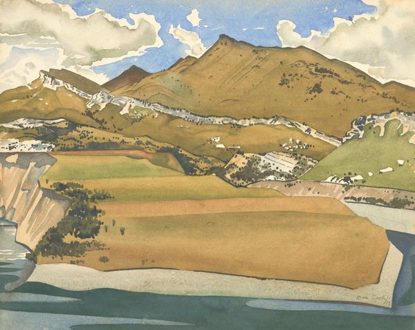 Curator: John Humphrey Spender's "Cornish Tin Mines" presents a landscape dominated by industry, yet softened by pastoral elements. Editor: It's oddly peaceful, isn't it? The bright yellow field and grazing cows juxtaposed against the stark industrial buildings create a really unique tension. Curator: Spender, known for his documentary photography, offers a commentary on the evolving British landscape and the impact of industrialization on rural life. Editor: Absolutely. I see a reflection of class dynamics, too. The mines represent labor, while the cows suggest a different form of capital, all in one space. Curator: The composition places the mines centrally, almost framing the landscape, a very deliberate choice in terms of conveying the industrial influence. Editor: It makes me wonder about land use, labor, and how communities negotiated these contrasting realities. The painting is a reminder of the deep historical shifts and competing interests inherent in our landscapes.