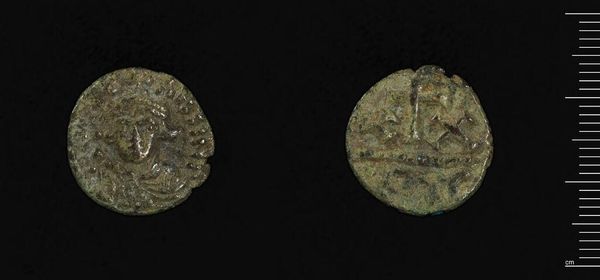 Editor: This is the "Half Follis of Herakleios, Rome," crafted by Abd-al-Malik of the Umayyads. Given its eroded surface, I'm curious about the stories locked within this coin. What symbols stand out to you? Curator: The cross, clearly visible on the coin, transcends its immediate religious meaning. It speaks to cultural memory, invoking the long shadow of Byzantium and its enduring influence, even as new powers emerged. The lettering beneath becomes a palimpsest of power. Editor: A palimpsest? That’s a great way to describe it! So, it's not just about currency but also a statement? Curator: Precisely. Images have power. Ask yourself, what does it mean when new rulers adopt and adapt existing visual languages? It tells us about legitimacy, continuity, and the negotiation of power itself. Editor: That reframes how I see this coin entirely. It's a fascinating glimpse into a complex cultural transition. Curator: Indeed. Coins aren't just money; they're miniature monuments, echoing the shifting sands of time.