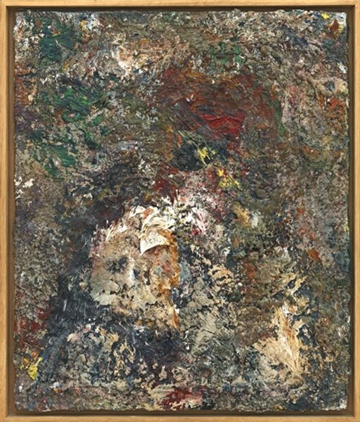 Curator: A roiling mass of color. It’s vibrant but also melancholic; a sensory overload tempered by a sense of decay. Editor: Indeed. This is "Autumn on a River Bank" by Arnold Peter Weisz-Kubínčan, likely created between 1940 and 1944. It's an oil painting characterized by a thick impasto technique. The artist built up the surface with layers of paint, creating a tangible texture. Curator: The application is quite vigorous, almost turbulent. The brushstrokes are distinct and chaotic, particularly in the denser regions, creating this lovely sense of dynamism and almost overwhelming volume. The interplay of light and shadow hints at a struggle, doesn’t it? Editor: Absolutely. Consider the sociopolitical context. This painting was made during the Second World War. Weisz-Kubínčan, as a Jewish artist in that era, would have undoubtedly been living under tremendous duress. One wonders if this expressive handling of paint serves as an outlet for suppressed emotion. Curator: That is what Expressionism is meant to convey, and Weisz-Kubínčan surely succeeds in capturing profound turmoil using color and textural expression alone. Look how the brushstrokes coagulate, constructing that central mass in reds, yellows, and deep browns against a teal and golden yellow foliage. It is evocative without being explicit. The eye must assemble the picture from fragmented sensations of color and volume. Editor: It's also worth noting the potential influence of Fauvism and Post-Impressionism in his approach, blending visible brushstrokes with expressive color and abstraction to convey a potent, though perhaps veiled, social commentary during a difficult period. Curator: Quite. The canvas becomes a battleground of hues. Editor: Ultimately, its impact lies in how it communicates those inexpressible tensions. We are given a window into his soul. Curator: The painting is at once unsettling and alluring. Editor: A beautiful meditation on transience.