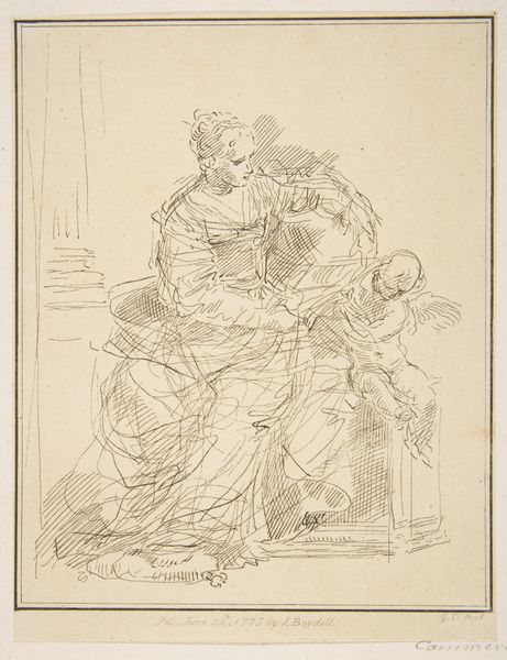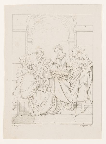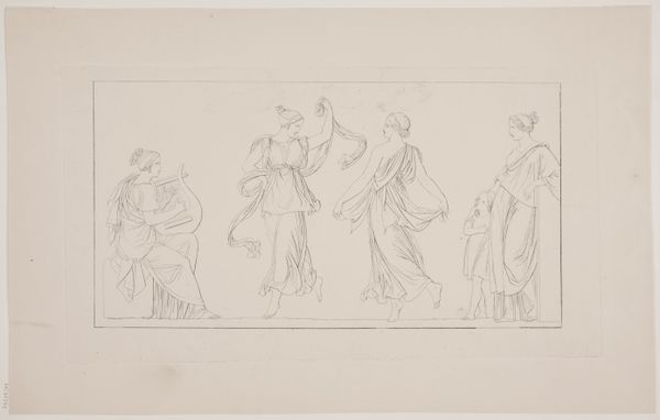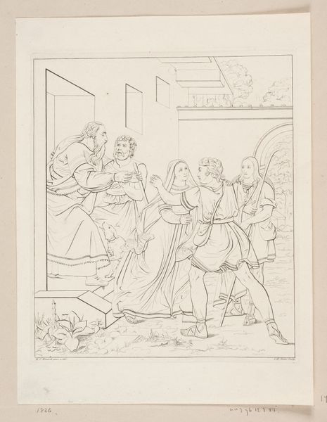 Edvard Sonne made this drawing, *Scene af Tobias' historie*, in Denmark. The story of Tobias comes from a book included in the Catholic and Orthodox Old Testament but regarded as apocryphal by Protestants. As such, Sonne's choice of subject matter speaks to the cultural context of 19th-century Denmark, where religious identity was a fraught issue. Sonne was raised in a Christian environment, and his religious upbringing may well have influenced his artistic choices. The image shows a biblical scene in which Tobias returns home. We see a young man embracing a woman while others look on. Sonne's image is rooted in the tradition of history painting, which was a major part of the curriculum at the Royal Danish Academy of Fine Arts, where Sonne trained. This pedagogical background shaped Sonne's artistic output. To understand this work better, further research into the religious and artistic climate of 19th-century Denmark would be fruitful. The social and institutional context in which Sonne worked shaped the meaning of his art.