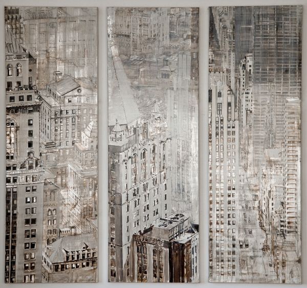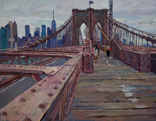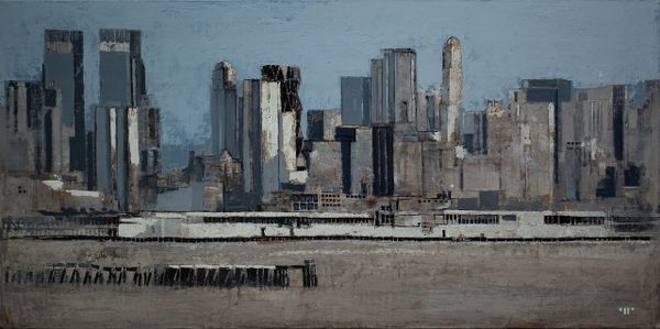 Patrick Pietropoli created this painting titled "Les 2 Ponts" in an unknown year, using an unknown medium, and its dimensions are 60 by 120 centimeters. The image is a somber, ghostly vision of New York City's bridges and skyline. The muted palette evokes a sense of melancholic contemplation, a possible reflection on the city's complex narrative of progress and loss. The bridges, symbols of connection and passage, also speak to histories of immigration, labor, and the physical and social divisions that shape urban life. The ghostly skyline questions the narratives of progress often associated with urban centers. This piece does not offer a celebratory image. Instead, it seems to explore a more nuanced understanding of urban identity, one that acknowledges the weight of history and the emotional undercurrents of the modern city. The painting invites us to consider whose stories are told and whose are erased in the ever-evolving narrative of urban life.