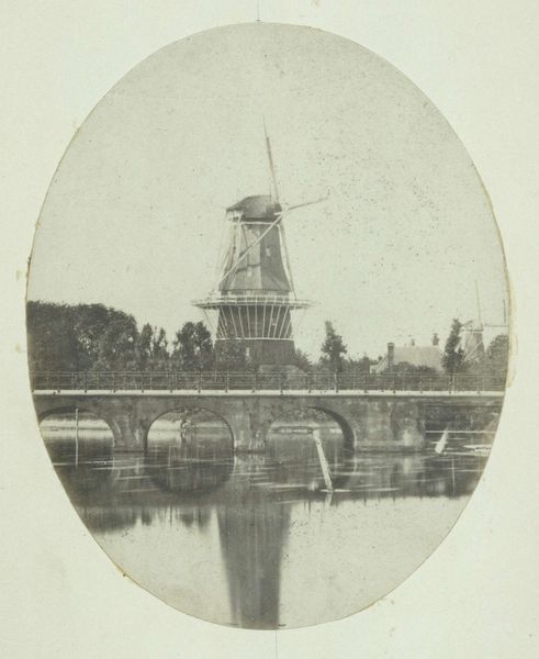 This photograph, "Houtzaagmolen bij Rotterdam," captures a Dutch sawmill near Rotterdam, presenting a muted palette with a focus on form and composition. The photographer, whose identity is unknown, skillfully uses light and shadow to define the windmill's structure, emphasizing its geometric shapes against the landscape. The bridge creates a strong diagonal line leading the eye towards the central structure. The photograph creates meaning through the interplay of industrial and natural elements. The presence of human figures adds scale and a sense of narrative, suggesting the integration of human life with the industrial landscape. The sepia tones evoke a sense of nostalgia, and the grainy texture adds a tactile quality to the image. The photograph invites us to consider how industrial structures coexist with the natural environment, capturing a moment in time where function and form blend seamlessly. Its enduring appeal lies in its ability to convey a sense of place and history through formal elements.