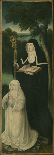 Editor: Here we have Aertgen Claesz. van Leyden's "The Raising of Lazarus," painted around 1530 to 1535 using oil paints. There's something strikingly melancholic about the kneeling figure draped in black, while the other woman, adorned and bearing a sword, emanates a sort of formidable presence. How do you interpret this work? Curator: It's a compelling juxtaposition, isn't it? The image certainly reflects the socio-political tensions of the time, particularly concerning religious authority. Consider the historical context: this work emerges during the Reformation. Who do you think the woman with the sword represents and what could that say about Dutch society during the 16th century? Editor: Given the historical setting, could she perhaps symbolize Justice or perhaps even a temporal authority, like a ruling noble, in contrast to the religious piety suggested by the kneeling woman? The contrast is stark. Curator: Precisely. The Northern Renaissance was rife with these visual dialogues about power and faith. The sword emphasizes temporal jurisdiction and potential control, while the mourning woman hints at an established faith possibly challenged. We must also remember the public function of paintings. Who was its intended audience and what meaning would they likely ascribe to this depiction? Editor: I guess this contrast reflects a societal debate unfolding. So the artist presents not just a biblical scene, but also uses it as a stage to talk about current cultural struggles, right? Curator: Precisely! The artist makes what might be an assertion about a cultural argument of authority between traditional religious observance and potentially emerging secular powers. Van Leyden captures how early modern Dutch painting became a vital tool to both propagate ideas and dissect cultural anxieties. What would you say you learned today? Editor: It's incredible to consider the layers of social and political messaging that could be embedded in what seems, on the surface, like a simple biblical scene! It's shown me how crucial the context of a painting’s creation truly is. Thank you!