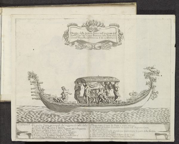 This is Antonio Francesco Lucini’s etching, *Gondel met allegorische figuren*, made around 1679 in Venice. In the 17th century, Venice was a major centre for artistic innovation, but also for elaborate public spectacles intended to impress. This print depicts a gondola laden with allegorical figures, likely part of a theatrical procession on the water. Look closely and you will see that each figure represents an idea, and together they form a complex symbolic tableau. We can see how the artist has used the gondola to display a vision of Venice as a place of beauty and harmony, full of cultural richness. However, such displays of wealth and power papered over a more complex reality. Venice, for all its splendor, was also a rigidly hierarchical society. Works such as this invite us to consider whose stories were being told. While it's an incredible spectacle, it is also a pointed form of social messaging. How might such a procession have felt for those excluded from its celebration? Through this allegorical scene, Lucini offers not just an image, but a perspective on Venice’s complex social fabric.