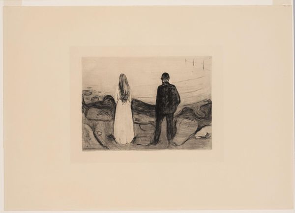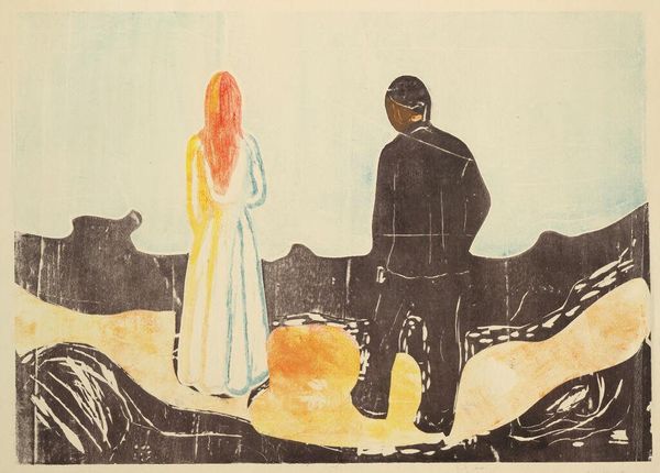 Curator: Edvard Munch's "Two Human Beings (The Lonely Ones)," which resides here at Harvard Art Museums, offers a stark look at isolation. What's your immediate reaction to it? Editor: The figures really evoke a sense of profound disconnection. They stand side-by-side, yet worlds apart; their posture and averted gazes amplify a feeling of sadness. Curator: Munch often used art to explore psychological states. Notice the landscape—it's abstracted, almost mirroring the internal turmoil of the figures. It reflects the socio-political alienation felt by many during the rise of modernity. Editor: Absolutely. The woman's bright hair is almost a halo, contrasting with the man's darkened form. That blonde hair could symbolize a lost innocence, a light dimmed by their shared loneliness. Curator: Munch aimed to depict the universality of human emotions. He even revisited this theme of isolation throughout his career. This shows us how these feelings are ingrained in our experience and society. Editor: It's a powerful visual statement. Munch understood how to externalize inner experience through emotionally charged imagery. The symbolism hits hard. Curator: Indeed, it's a stark reflection on the human condition. Editor: A reminder that even in proximity, we can be profoundly alone.