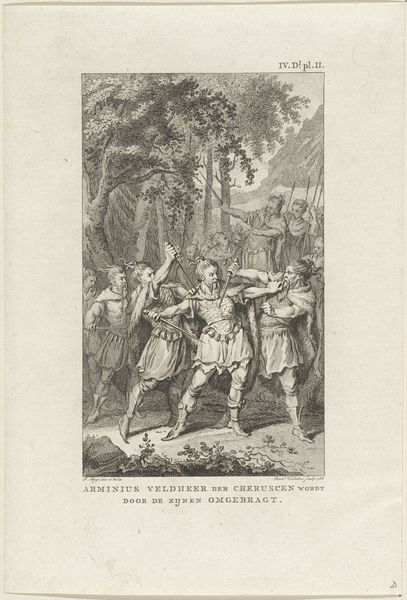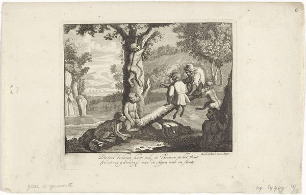 Bernard Picart made this print, "Don Quichot verwart een boerin voor Dulcinea," in the early 18th century using etching and engraving. Picart was a master of reproductive printmaking, and here he engages with Miguel de Cervantes’ famous novel "Don Quixote." The image depicts a scene where Don Quixote mistakes a peasant woman for his idealized lady, Dulcinea, a deception orchestrated by Sancho Panza. Made in the Netherlands, the print reflects a broader European fascination with Cervantes' novel, which was quickly becoming a cornerstone of Western literature. Dutch artists were at the forefront of illustrating literary classics for a growing reading public. This print offered a visual interpretation of a key scene, inviting viewers to reflect on the themes of illusion, social satire, and the power of imagination found in Cervantes' work. To fully appreciate Picart’s print, one can look into the history of Dutch printmaking, the reception of "Don Quixote" in the 18th century, and the social dynamics depicted in the artwork. Art like this reminds us that its meaning is always embedded in a specific cultural and historical moment.