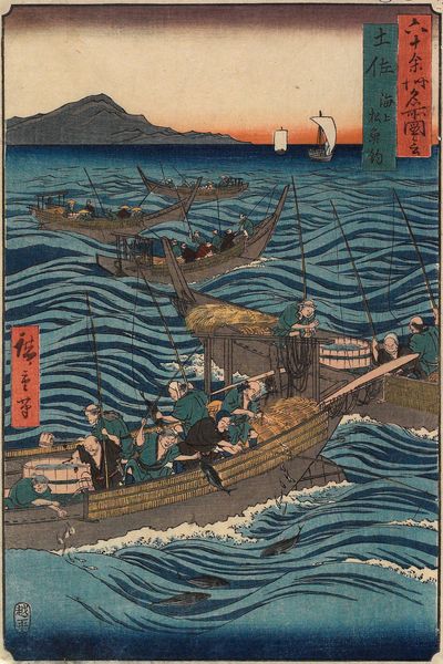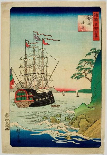 Utagawa Hiroshige crafted this woodblock print, "Kusatsu," capturing a serene harbor scene filled with sailboats. These boats, with their delicate sails, aren't just vessels of trade; they are potent symbols deeply woven into the cultural fabric of Japan. Consider the single mast rising assertively from each boat. This recalls similar imagery in ancient Mediterranean ship depictions where masts symbolized not only navigation but also strength and stability. We see how this symbol, born from practical necessity, transcends geography and reappears, carrying with it echoes of humanity's persistent relationship with the sea. The calm, reflective water mirrors these symbols, intensifying their impact. The psychological effect is profound – a sense of harmony and the quietude of passage. These boats floating, connecting past and present, reminding us of the ever-turning wheel of history.