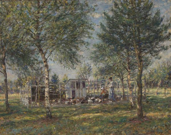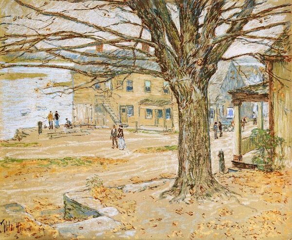 Editor: So, this is Childe Hassam’s "Old Mumford House, Easthampton," painted in 1918. It’s done in mixed media and feels like a sunny, tranquil slice of American life. There’s almost a deliberate obscurity, though…like a pleasant memory just out of reach. What symbolic layers do you see here? Curator: Hassam's impressionistic style cloaks the scene, yet the architectural landscape carries potent symbolism. The house itself is not merely a structure, but a repository of memory. The figures become archetypes—a familial presence, blurred as they interact with the symbolic threshold of the gate. Consider how the light filters—a deliberate choice emphasizing the romanticized idea of 'home'. Editor: So, the obscuring effect actually heightens the symbolic resonance? The everyday is made somehow… mythic? Curator: Precisely! It transforms the mundane into an emblem. Note the trees—reaching like protective arms—natural guardians of domestic space. Hassam leverages recognizable forms but imbues them with emotive cultural weight. Consider also the broken fence – does it denote the disintegration or the slow decay of societal boundaries and traditional structures? Editor: That’s fascinating. I was so focused on the sunny feel, I almost missed that undercurrent. Now the broken fence feels less pastoral, and more…fraught? Curator: The beauty belies the complexity. Impressionism isn’t just about pretty surfaces, it’s about how we project meaning. Editor: This makes me want to reconsider my initial impression; to dig beneath the surface and unearth those symbolic narratives. Curator: Indeed! Keep exploring and unveiling these stories that paintings whisper. The rewards are tremendous.