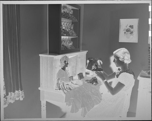Curator: This is an Untitled work by Jack Gould, part of the Harvard Art Museums' collection. It depicts a man and a woman sitting on opposite sides of a desk. Editor: It feels like a stage set, doesn't it? All the props so carefully placed. A little world contained in this tiny black and white frame. Curator: Indeed. Gould's choice of gelatin silver print as the medium, given the social context of accessible photography at the time, allowed for mass dissemination and a standardization of image-making. Editor: It’s fascinating how the negative image lends an ethereal quality, almost ghostly. I see the desk acting as a clear border between the two figures. What do you think they’re discussing? Curator: Considering the photographic process and its reliance on darkroom labor, this image speaks to a specific mode of photographic production and its social implications. Editor: For me, it's a quiet moment, a story unfolding. A shared space, yet a silent divide between these two. Curator: The image’s material existence and method of production are just as crucial as any narrative interpretation we might impose. Editor: Perhaps, but the human element, the mystery, still whispers so loudly.