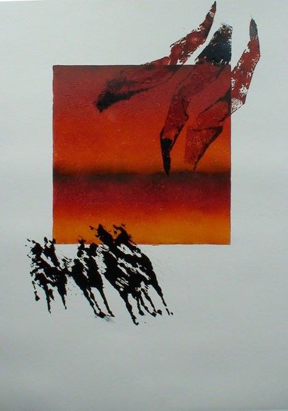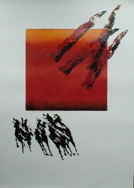 Małgorzata Serwatka created "Horses I" using printmaking techniques. At first glance, the composition is divided into two distinct areas, each playing with the viewer's perception of space and form. The upper section is dominated by a square field of color, ranging from warm oranges to deep reds, seemingly solid yet destabilized by aggressive marks. The splatters of black extend outward, breaking the solidity of the square. Below, a series of horses are represented with quick, gestural strokes. The contrast between the abstract square and recognizable figures introduces a dynamic tension. This juxtaposition might be Serwatka's way of exploring themes of freedom and constraint, where the wild, uncontainable essence of the horses is set against the ordered, but disrupted, block of color. The piece challenges us to consider the ways in which we perceive both form and freedom, and how these elements can coexist, or clash, within a single frame.