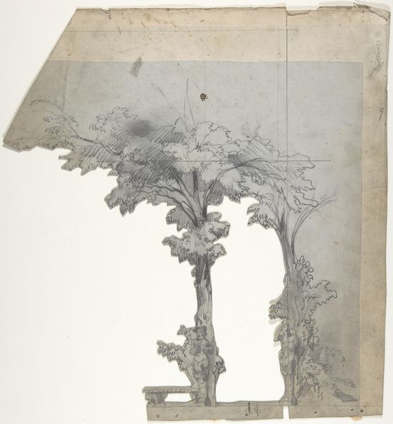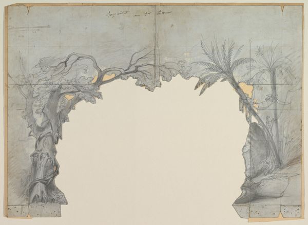 Eugène Cicéri created this stage set design for the Paris Opéra using graphite and watercolor on paper. The composition features a proscenium-like frame, defined by meticulously rendered trees and foliage. The cool graphite tones, accented by subtle watercolor washes, evoke a serene, almost melancholic atmosphere. The artist has carefully constructed a view into a theatrical space, and this invites us to consider how meaning is created through both artifice and illusion. The grid-like structure underlying the drawing reveals Cicéri’s formal approach, reminiscent of structuralist concerns with underlying systems. The use of natural motifs reflects Romanticism, yet the calculated design suggests an engagement with the semiotics of space and representation. The set design becomes a sign, pointing beyond itself to the artificiality of the stage and the constructed nature of our perceptions. Consider how Cicéri’s delicate yet precise rendering blurs the line between the organic and the geometric, challenging our fixed notions of nature and art.