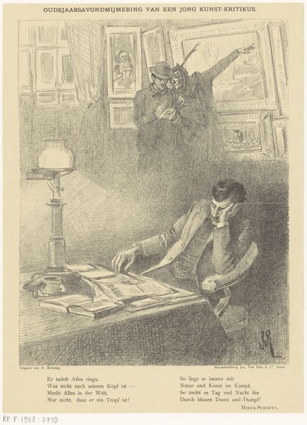 Curator: This drawing, titled "Les Quatre Dames" is attributed to Théophile Alexandre Steinlen. It is rendered in pencil and ink. Editor: It feels… haunted. The man hunched over his desk, weighted down, while these spectral women dance, float, haunt his space. Like a visitation in the dead of night. Curator: Absolutely. Steinlen’s work often captured the mood of Belle Époque Paris, portraying both its glamour and the anxieties of the working class. This piece reflects a fin-de-siècle fascination with the spiritual and the symbolic, doesn’t it? The contrast is stark, that grounded desk of daily labor, then *poof*, ethereal women emerge from the inky darkness. Editor: Ghosts of inspiration, maybe? Or the yearning for something beyond the everyday grind. I see the lamp illuminating his immediate reality, while these women exist almost in his head space, like wisps of smoke. The composition makes you wonder if he’s imagining them or if they are external, supernatural presences. Curator: The drawing’s symbolic approach suggests a link to the Symbolist movement, especially in how it evokes emotion through suggestion and atmosphere rather than direct representation. Art for art's sake, almost, beyond traditional roles assigned by the market. Editor: Funny, that this almost "feminine" representation then also hinges on who the central figure of the burdened artist might be, working at that desk with those accoutrements, masculine. Did Steinlen wrestle with that interplay? Or maybe the ladies offer hope. Curator: Indeed. Steinlen understood that Parisian society’s realities were complicated, shifting constantly because of labor exploitation, class struggles, rapid urbanization, but also intellectual developments in psychology and symbolism... What these meant for image-making... That the 'flaneur' aesthetic no longer reflected the mood of the city. The image suggests this is no simple 'artist' trope; perhaps this artist also feels alienation from society or even from his creative output. Editor: Well, regardless of what the 'true' meaning is, there's a reason these images still resonate. It's about those moments where creativity is the only life raft! So raw and real even when surrounded by what may or may not be spirits! Curator: Exactly. The visual dichotomy that results makes us ask probing questions. It becomes, ultimately, a mirror.
