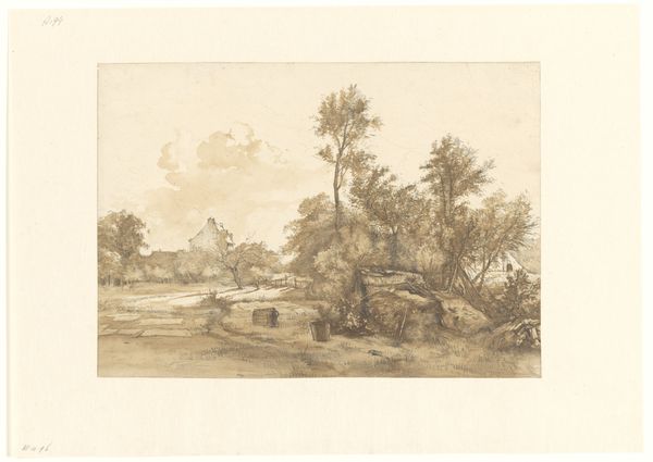Curator: Immediately, I sense a quiet solitude here. The muted tones and the density of the foliage… It feels introspective. Editor: Indeed. This is “Boomgroep op vlakte,” or "Group of Trees on a Plain," attributed to Jean Alexis Achard. While the precise year isn't pinpointed, it’s placed somewhere between 1817 and 1884. Curator: Achard’s choice of medium – the print, the drawing– that’s what strikes me first. These materials have been around since… well, since forever! So accessible. Did it have anything to do with the accessibility of landscapes in his era? Editor: The multiplication enabled by printmaking processes – engraving, etching, woodcut - ensured wider circulation beyond the elite circles of traditional painting, thus fitting landscape depictions with nascent democratic aspirations in 19th-century Europe. It echoes with a burgeoning market for affordable art. Curator: Absolutely! And let's look closer. It appears the landscape is shaped with labor-intensive processes - careful etching, cross-hatching… There's a clear investment of time and effort, yet this print may have reached the hands of ordinary people. Editor: It invites thoughts about leisure too. Who gets to wander in the countryside, contemplating these trees? Was the consumption of nature an elitist symbol? Achard himself comes from a rather modest background and understands this landscape in his blood, so maybe the trees offer the rural population a mirror. Curator: A mirror, perhaps, framed by the forces of accessibility and artistic choice? What do you mean exactly? Editor: Access is a matter of social classes, while artistic choice relies on which available production process you favor. Here the traditional production choice is to render plain-air drawings, sketches as reproducible form and not end in themselves, therefore allowing ordinary population to enjoy these subjects. The etching, engraving, and various forms of printing processes underscore a movement away from singular masterpieces toward accessible artworks. Curator: So the distribution becomes as crucial as the subject. The seemingly simple portrayal becomes a fascinating knot of socio-economic conditions! It reframes how we see art's public role. Editor: Precisely. It's not just an image of nature; it's an artifact reflecting the era’s dynamics between art production, societal class, and leisure consumption. The group of trees bears more than botanical information, but it tells stories of industrial transformation and shifting access to visual imagery.