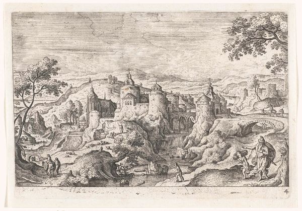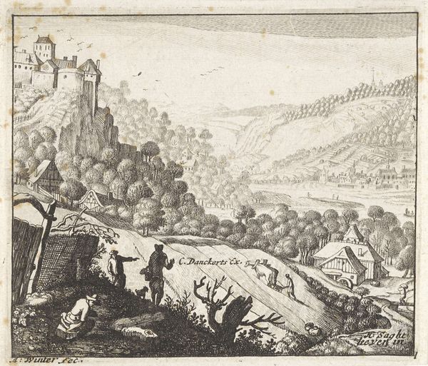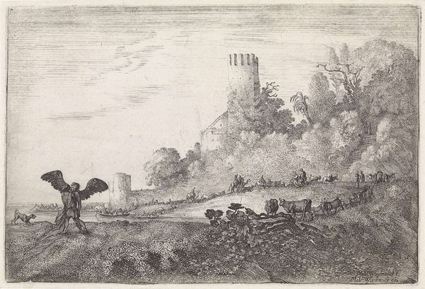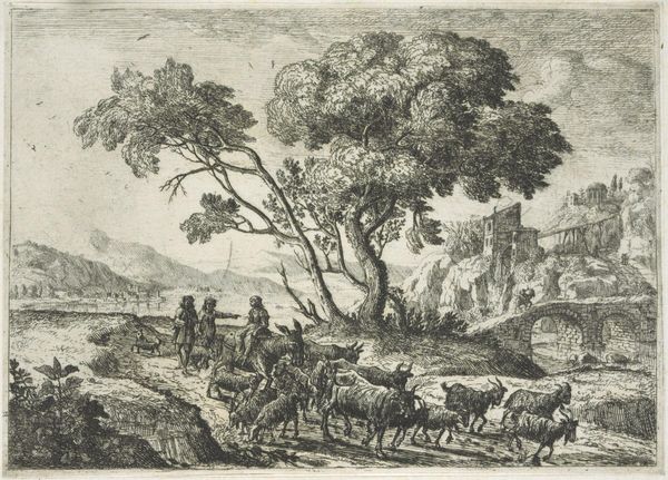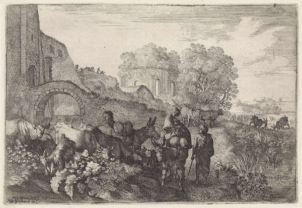 Curator: Ah, here we have "Landscape with Travelers" by Moyses van Wtenbrouck. It's difficult to pin down the exact date; some suggest it’s from around 1600 to 1710. What are your initial thoughts? Editor: Well, it feels like a dream half-remembered. That intricate etching—so delicate—gives it this ephemeral, almost melancholy air, doesn't it? A little theatrical too; there’s a stage set quality about the placement of the ruin and those looming trees. Curator: Yes, I see that! There is something evocative about those dark lines. It feels so intentionally arranged. Consider those travelers; the way they meander with their donkeys creates a feeling of slow journeying... and a deeper wandering too, I think. Editor: Definitely. The donkey, weighed down with packs, reminds me of burdened resilience—a visual echo of the human condition perhaps. The path forward isn’t clear but that slow trek continues onward. And look at the contrast, the ruined structures offer this symbol of permanence, but it’s crumbling, decaying, fading like memory. It is an emblem of lost glory, perhaps a reminder of life's transience. Curator: Precisely. And what do you make of those grazing animals? They add such a bucolic feel. They almost seem indifferent to the human dramas unfolding. Editor: Animals as a constant counterpoint! Beautiful. Like nature is ever-present, always witnessing our ephemeral strivings. Also, given its age, consider what kind of paper the image is printed on and the inks that create the image: a whole forest that became paper and all the lives who dug pigments and created inks. This is more than an image. Curator: I am utterly enamored with how you brought that to life, highlighting that even materials and physical substrates hold an emotional narrative. Do you think others feel a sense of time traveling into this scene, in those pre-industrial ages where nature dictated the rules? Editor: One can only hope! Hopefully others can engage beyond the picture itself; perhaps ask what resonates with their own path through life and perhaps even consider our place amongst the tapestry of epochs!