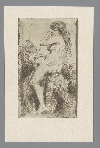 Editor: So, here we have Willem Linnig the Younger's "Angel Blowing a Trumpet," created in 1887 using etching and engraving. The angel seems caught between earthly swirls and wisps of smoke or clouds. The piece evokes a kind of urgent announcement, but to whom or what? What do you make of the symbolism here? Curator: The angel with a trumpet! It’s fascinating how Linnig utilizes this classic symbol. Trumpets, throughout history, signal not just announcements, but transformations. Consider its biblical roots – trumpets announcing judgment or pivotal moments. What do you see in the *angel’s* stance, in its gesture? Editor: She seems almost hesitant, as though caught mid-action. Her gesture doesn't command; instead, it presents. Curator: Precisely! Linnig, working within a Romantic and Symbolist frame, twists conventional angelic imagery. Is this about divine command, or is it a more personal, psychological unveiling? Notice the nudity. How does that contribute to the image’s narrative? Editor: I guess the nudity suggests vulnerability, a raw honesty accompanying this announcement. It moves away from a majestic messenger of God towards something more human and intimate. Curator: Yes, exactly! It disrupts a traditional association of power. She’s not descending from on high, but almost emerging from the subconscious, announced by her trumpet, an allegory of Romantic and Symbolist personal and cultural revelation. And do you notice the difference in styles? The foreground's rough engraving gives the image stability and drama, the background with a loose symbolic ethereal feeling that evokes the in-between. Linnig is really playing with those borders of the conscious and unconscious! What do you make of that tension? Editor: It adds to that sense of uncertainty, like the message itself is still forming. I never considered the mix of Romanticism and Symbolism like that! Curator: These symbols really build a vocabulary over time. The piece then challenges our preconceptions about authority, unveiling truths about what and whom it serves, making us rethink both personal and cultural symbols. It makes one wonder about what other symbols are there in this era! Editor: That really sheds new light on this. I see the layers of meaning so much more clearly now.