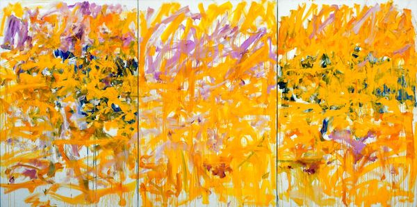 Sam Francis made Beaudelaire with paint, though the exact date is unknown; it is a pure exploration of process. The whole surface seems like a big, happy accident, full of drips and splatters in one concentrated shade of yellow. You can see how the paint pools and spreads, each mark telling a bit about how Francis was moving. It’s almost like watching him dance with the canvas. Look at the lower left corner. See how the curved shapes overlap, kind of like a deconstructed rainbow? The paint is thin, almost watery in places, but then thickens into juicy blobs. Those little details, the way the paint catches the light and the way the colors blend, give the painting its energy. It reminds me a little of Joan Mitchell’s loose and free gestures, both artists letting the paint do its thing, finding beauty in the unpredictable. Ultimately, the magic of this piece is that it’s not about any one thing. It’s more about the feeling, the joy of making, and the endless possibilities of paint.