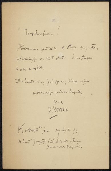Editor: We're looking at Jan Toorop's "Brief aan Philip Zilcken," made sometime between 1895 and 1899, using ink on paper. It’s housed here at the Rijksmuseum. The first thing I notice is the delicate and almost fragile quality of the handwritten text against the ruled lines of the paper. How would you interpret the aesthetic choices within this work? Curator: The composition certainly highlights the interplay between order and fluidity. Note how Toorop uses the grid of the lined paper to structure the placement of the text, yet the cursive script introduces an element of organic form, disrupting the rigid geometry. Consider the tonal variations within the ink itself; darker, heavier strokes emphasizing certain words create a visual hierarchy, leading the eye across the page in a specific rhythm. What does the juxtaposition of line and letter suggest to you? Editor: I suppose the grid provides a stable foundation, and the handwriting humanizes it. Does that make the work more dynamic, given its apparent simplicity? Curator: Precisely. It is in these contrasting elements, the interplay of the rigid and the fluid, the geometric and the organic, that we discover a profound visual tension. Toorop exploits the inherent qualities of his materials to articulate a nuanced aesthetic statement. The deliberate strokes, the carefully chosen weight of the ink – all contribute to the overall visual experience. Editor: So, in this instance, form really does define function. It’s fascinating to consider such a commonplace item through this lens. Curator: Indeed. Examining Toorop’s manipulation of simple elements transforms our perception, revealing a hidden complexity within the seemingly mundane. A successful foray into formal analysis, I'd say!