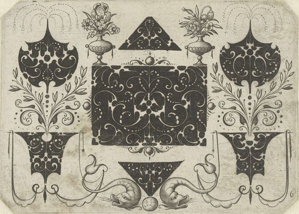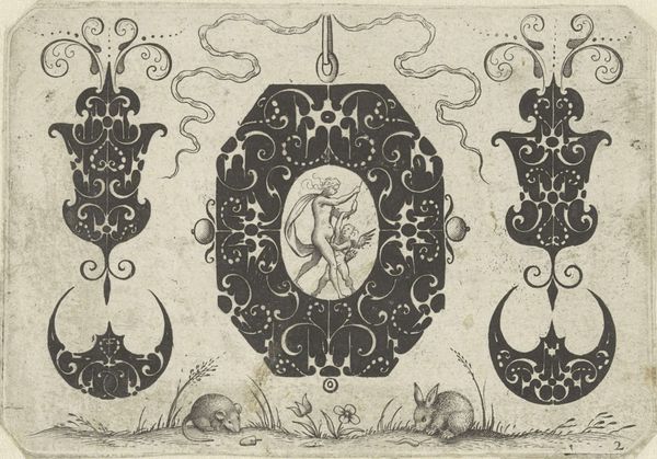 This is Jacques Hurtu’s “Design for metalwork with flowers and animals,” created around 1600 using etching. The design integrates floral motifs like lilies and violets, alongside hunting scenes, all framed within symmetrical patterns. The symmetry and the floral designs take us back to ancient motifs found in early Roman decorations and even further back, in Minoan frescoes, evoking a sense of order and the bounty of nature. But observe how the inclusion of a hunting scene introduces a counter-narrative of human dominance and the cycle of life. Consider, too, the symbolic weight of the hunt. It's a recurring theme in art across cultures and history. From Paleolithic cave paintings depicting the hunt as a struggle for survival, to its later associations with aristocratic leisure. The depiction taps into a primal collective memory, where the act of hunting is both necessary and transformative. The design becomes more than decoration, it’s an interplay between nature and culture, instinct and intellect.