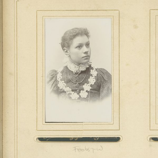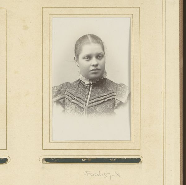 Editor: We’re looking at "Portret van een jonge vrouw," or "Portrait of a Young Woman," created between 1874 and 1887. It’s a gelatin-silver and albumen print. The subject seems reserved, dignified, a woman held in amber. What story do you think this photograph tells? Curator: Oh, the quiet dignity of the albumen print. It whispers, doesn't it? To me, it speaks of fleeting moments and enduring selves. This young woman is caught between the rigid social constraints of the time and her own burgeoning individuality. Do you notice the severity of her attire against the soft focus? It’s a beautiful tension. I always wonder what she dreamed of, locked within that frame. Did she have passions, rebellious thoughts, longings that remained unspoken? What sort of future did she imagine for herself? Editor: I hadn't thought about it that way. It's like the photo preserves her, but also almost imprisons her in the social expectations of the time. Curator: Precisely! It’s a kind of spectral dance between presence and absence, isn’t it? And that very lack of precise information invites us to complete the narrative, to give her a voice, a history. What is particularly moving for you? Editor: Maybe it's the subtle expression on her face, as if she's containing a whole world inside. I see more in this than just a static portrait now. Thank you! Curator: And I find that your openness makes me want to look deeper too. I see in this image not just a bygone era, but a continuing thread of women navigating expectations and claiming their own space.
