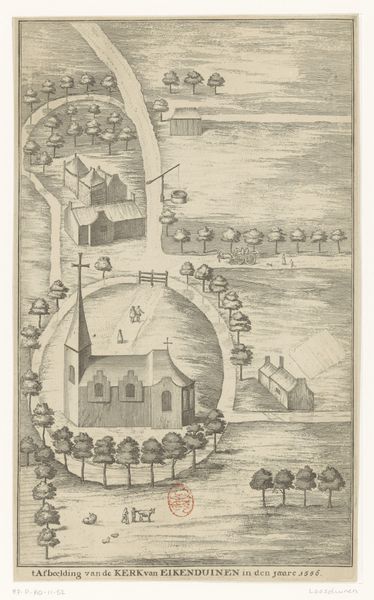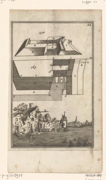 Editor: This is an illustration by Romeyn de Hooghe from 1672, titled 'Illustratie voor 'Den Arbeid van Mars' van Allain Manesson Mallet.' It’s a drawing and print on paper, combining ink and engraving techniques. What strikes me is the stark contrast between the geometric precision of the fortress plan at the top and the more organic, detailed cityscape below. What story do you think this contrast is trying to tell? Curator: Ah, a question of worlds colliding, perhaps? It makes me think of the age of reason attempting to impose itself upon the unruly beauty of the natural world. Or maybe the opposite, how even the most rigid, rational constructions are inevitably softened and worn by the textures of life, like the moss on old stones. What emotions do you feel while looking at this artwork? Is there a tension between order and chaos? Editor: Definitely a sense of tension. The orderly fortress feels so detached from the town, almost like it’s looming over it, while the positioning of the church makes it appear as the main defense of the citizens below. Curator: That's an astute observation, and this brings into light the tension present in most human settlements throughout history. The drawing serves not just as documentation, but also as commentary, right? And what I enjoy most about it is that you may feel some nostalgia with it, it tells its own story for each viewer! Editor: Absolutely! I think seeing this made me reflect on the roles of military structures within communities throughout history and its integration with elements such as nature or religion, depending on each time. It gives the viewer the possibility of creating their own narrative for each artwork they stumble upon. Curator: Yes, beautiful point! Art enables conversation between epochs and cultures through symbolic dialogues. I'm sure it can offer us much more wisdom with continuous contemplation and examination.