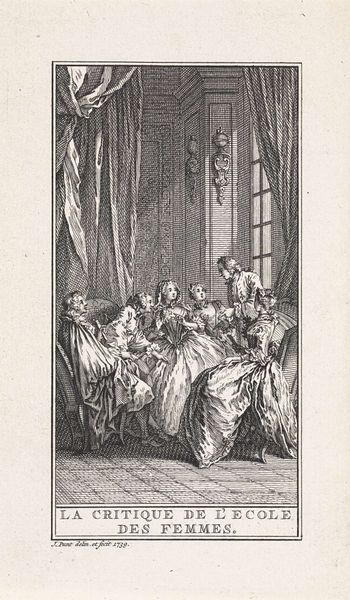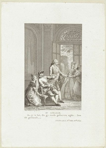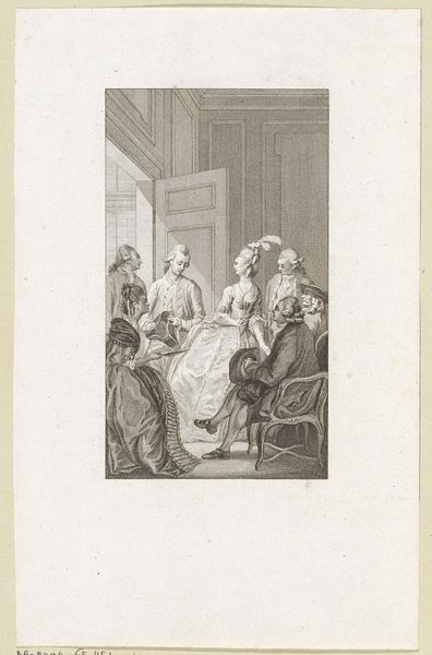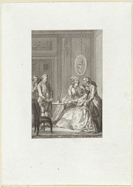Reinier Vinkeles created this print, 'Vertrek vol huilende mensen', using etching. The composition is dominated by a central grouping of figures expressing intense grief. The artist uses tightly controlled etched lines to define forms and convey a sense of overwhelming emotion. The linear quality of the etching lends itself to detail, especially in rendering the elaborate costumes of the figures, yet this precision is juxtaposed with the disarray of their emotional states. The figures are arranged in a way that directs the viewer's gaze towards the center, where the most expressive displays of sorrow are evident. This arrangement draws on the conventions of Baroque art. The architecture in the background is minimal but serves to contextualize the scene within a formal interior, creating a tension between the private emotions of the figures and the public setting. The work prompts questions about the representation of emotion in art and its relationship to social space. The artist’s technique invites a formal appreciation of the expressive potential of line and form, and the interplay between control and chaos.