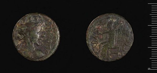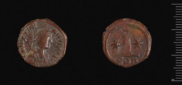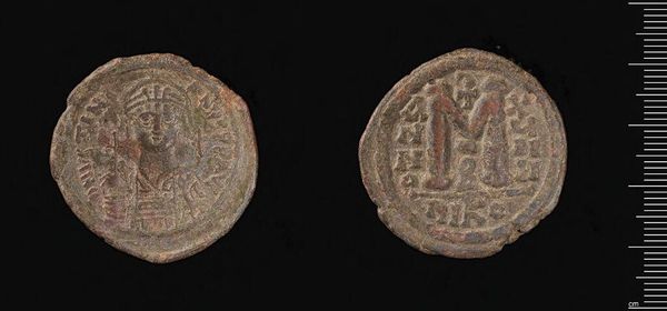 Curator: Here we have a coin of Justinian I, weighing 22.1 grams. Editor: It feels worn, weighty with the passage of time and imperial ambitions. Curator: Note the meticulous detail. On one face, the profile of Justinian himself, encircled by what appears to be a beaded border. The other side features a large "M" denomination between two figures. Editor: Yes, but this isn't just currency, it's propaganda. Justinian's face, even on this small scale, projects imperial power. The coin served as a constant reminder of his rule, shaping public perception, especially during the Nika riots. Curator: The medium itself—the metallic composition and the relief—lends a tactile quality to the Emperor’s image. The wear on the coin only enhances the texture, emphasizing its physical presence. Editor: The material itself is an assertion of wealth extracted from labor and land. Think of the social inequality that allowed for such an artifact to exist! Curator: It is truly remarkable how such a small object can be so dense with meaning. Editor: Absolutely. It's a poignant reminder of the Byzantine Empire's complex social and political landscape.