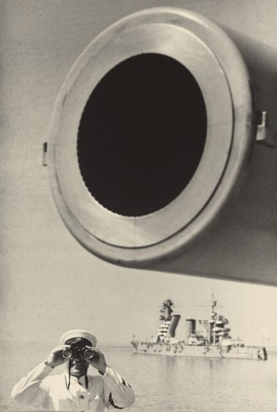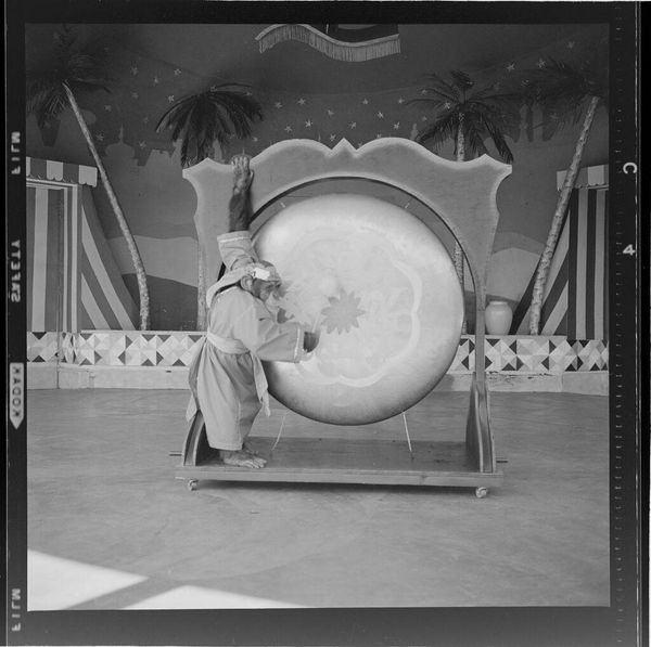Editor: This photograph by Jack Gould shows a chimpanzee in costume playing a large drum, and it strikes me as quite surreal and theatrical. What do you see in this piece? Curator: The chimp, a symbol of the wild, juxtaposed with the drum, an instrument of ritual and performance, creates a powerful tension. What memories and cultural associations does this image evoke for you? Editor: It feels a bit unsettling, like a commentary on the performance of identity. Curator: Precisely. The layers of costuming, the backdrop, the act of playing—they all speak to how we frame and understand ourselves and others. Editor: It’s interesting how a simple image can hold so much cultural weight. Curator: Indeed. And the negative adds another layer of mystery.