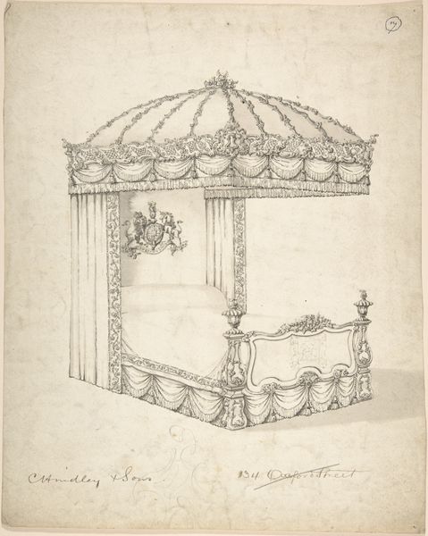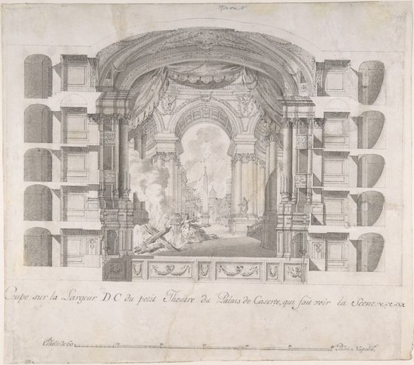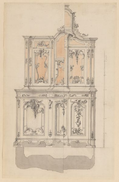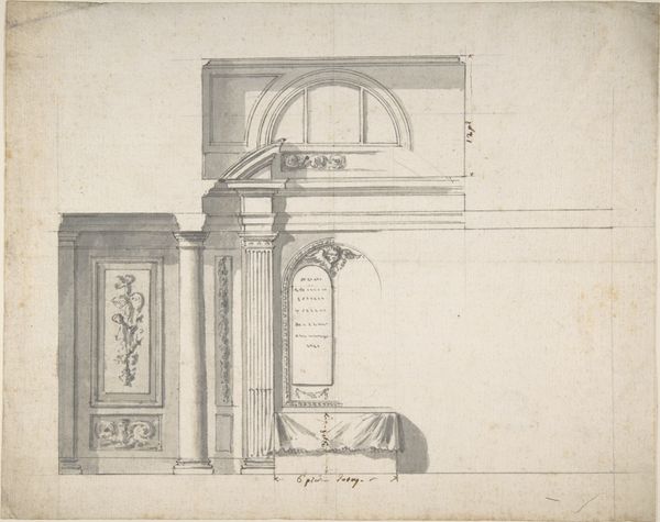 Curator: Ah, here we have a rather fascinating rendering – a stairway elevation coupled with a design for an ironwork balustrade. The anonymous artist rendered it with watercolor, etching, and drawing somewhere between 1695 and 1705, right on the cusp of the Baroque and Romantic eras. Look at that ironwork – doesn't it just whisper tales of swirling skirts and hushed rendezvous? Editor: It's very pretty, almost dreamlike! It looks like it’s straight from a fairy tale with these archways and balustrades! What do you make of this work? Curator: Dreamlike, indeed! That quality, that *almost* tangible fantasy, is partly what makes it sing to me. Beyond the pure artistry, I wonder about the architect's intentions. Stairways, then as now, were so much more than just functional! Do you notice anything that tells you how the architect thought about the inhabitants of this home? Editor: I see, now that you point it out, the crown emblem within the arch! Curator: Exactly! A statement of identity. Remember, during this period, architectural details weren't just pretty decorations. Each had a voice! It's interesting, isn't it, how a simple stairway plan can be so full of secrets and whispers if you listen closely. What secrets do *you* think this stairway holds? Editor: Wow! I never thought a stairway design could be so revealing! It shows the importance of how you consider all angles when looking at art. Thanks for opening my eyes. Curator: And thank *you* for the fresh perspective. It’s easy to get lost in the details, so seeing it anew is a welcome breath of fresh air. Onwards!
