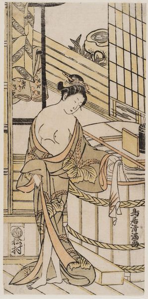 Editor: This is Okumura Masanobu's "Standing Woman Holding Tanzaku (Poem-Slip)," a woodblock print. The lines are so delicate! What do you make of the artist's choice to depict everyday life with such care? Curator: The materiality is key. Woodblock printing allowed for mass production, bringing art to a wider audience. This challenges traditional notions of unique, high-art objects and emphasizes art's role in everyday consumption. How does the print's accessibility change its meaning? Editor: I guess it democratizes art, making beauty more available. I hadn't thought about the connection between the medium and the message that way. Thanks! Curator: Precisely. It highlights the labor involved in production and the artwork's function as a commodity. Always consider how the means of production shape our understanding.