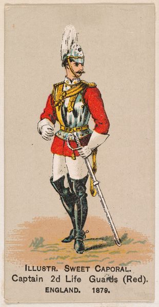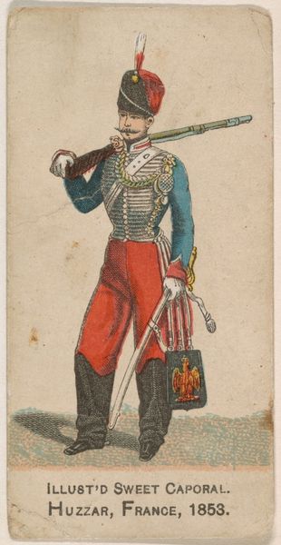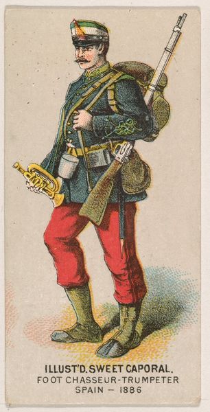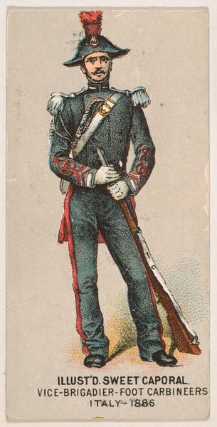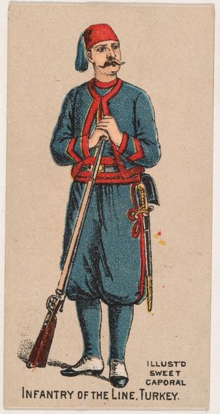 This chromolithograph was made in the United States by Kinney Brothers Tobacco Company as a promotional item for Sweet Caporal Cigarettes. It depicts a private in the Busch Zouaves, a militia from St. Louis, Missouri. The image offers a glimpse into the visual culture of the late 19th century, where commercial interests intersected with military romanticism. The Zouaves, known for their colorful, North African-inspired uniforms, were a popular subject in American art and photography, evoking a sense of exoticism and martial prowess. Here the commercial company, Kinney Brothers, connected their product to the consumer’s desire for sophistication and worldliness. Tobacco companies were major players in the shaping of popular opinion. To fully understand this image, we can turn to archives of advertising ephemera, military histories, and studies of consumer culture. Understanding its place in the visual landscape of its time reveals the complex social and economic forces shaping artistic production.