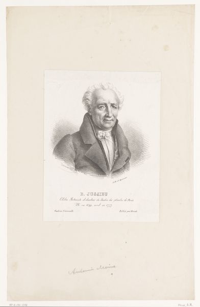 This is a portrait of Jan Blom by Guillaume Philidor Van den Burggraaff, made using lithography, a printmaking process that democratized image production in the 19th century. Lithography involves drawing on a flat stone or metal plate with a greasy substance, then treating it so that ink adheres only to the drawn areas. This allowed for relatively quick and inexpensive reproduction of images, making art more accessible to a wider audience. Look closely, and you can see how the texture of the stone, even the artist’s mark-making, has been transferred to the paper. The choice of lithography here isn't just about convenience; it reflects a shift in how art was created and consumed. Unlike traditional engravings that required highly skilled artisans and lengthy production times, lithography opened up new possibilities for artists to create and distribute their work, tying artistic production to broader social issues and new technologies of the time. Considering the materials, making, and context helps us understand the full meaning of this portrait, breaking down the old separation of fine art and craft.