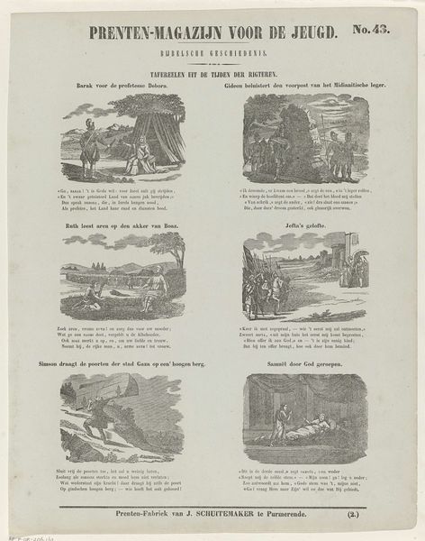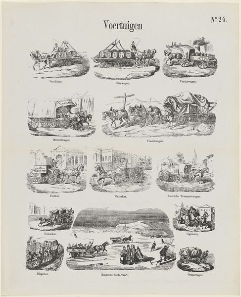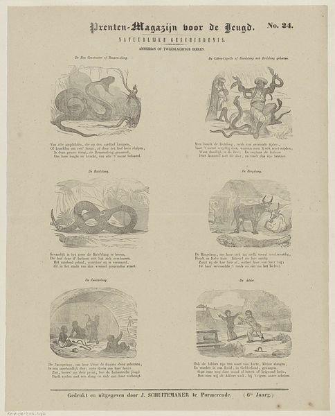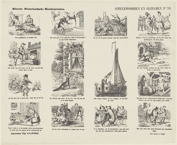 Curator: Here we have "Visschen" by Dirk Noothoven van Goor, an engraving that likely dates between 1850 and 1881. It looks like a page from a children's magazine? Editor: It’s oddly charming. A bit crude, but also humorous with its little vignettes. I'm immediately drawn to the almost caricatured style. It has that appealing old engraving aesthetic. Curator: Van Goor ran a "Prenten-Fabriek," so printmaking was very much his domain, geared toward children's educational materials. These scenes seem to depict different fish, though perhaps not entirely realistically, from "De Haas" to "De Zeewolf" – the Sea Wolf. It seems like they aimed to entertain as much as inform. Editor: The choice of animals to showcase is certainly curious! Beyond merely illustrating aquatic life, they seem like metaphors, archetypes even. A 'sea wolf', a 'trembling crab' these creatures quickly become symbols. Curator: Indeed. Consider how publications shaped understandings of the natural world for young audiences at that time. Beyond scientific accuracy, the visual presentation could reflect prevailing cultural attitudes or moral lessons associated with specific creatures. "De Sepia of Inktvisch", which might translate to 'Sepia the Octopus' is a character with a suitcase, perhaps on a journey. Editor: Look at that octopus character – with its luggage and vaguely human stance. There’s a strong element of storytelling implied within the animal forms themselves. These pictures were undoubtedly effective ways of not only conveying what the animals looked like but also giving these animals identities and backstories for their readers to attach to. Curator: Exactly, and as a form of "natuurlyke geschiedenis", they likely also aimed to impart knowledge about geography and foreign cultures through these animal portrayals. What messages do these images perpetuate, perhaps unconsciously? It's intriguing to speculate on that social level. Editor: A critical aspect is considering the impact on its audience. These were meant to educate, sure, but how do narratives subtly shape their perceptions of "foreignness," "the sea," the creatures that lived outside familiar spaces. These stories are very potent shapers of social outlook. Curator: Thinking about van Goor's “Prenten-Fabriek” on a factory-level – how images got circulated, consumed, what purposes did illustrations serve. The blending of natural history and perhaps folklore makes it intriguing. Editor: Right, the narrative function merges seamlessly with potential ideological or societal influence. Fascinating that even an image meant for children can reflect wider dynamics!