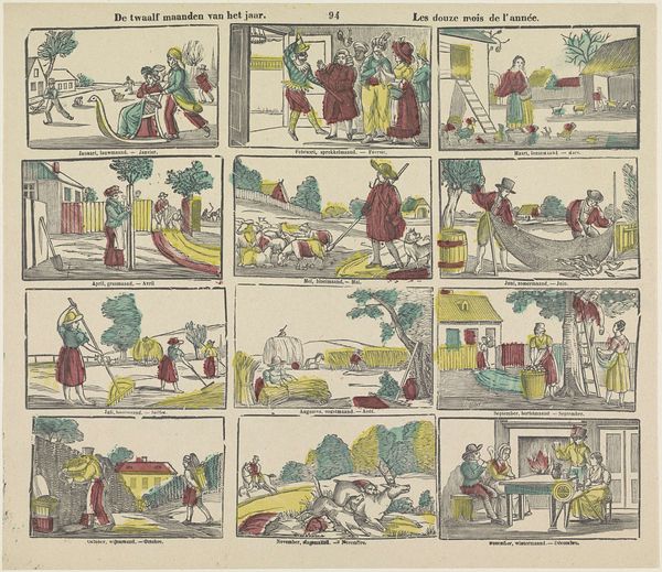 This color print titled, *The Twelve Months of the Year*, was made by Glenisson & Sons. This print is one of many from the era that depicts daily life with vignettes of seasonal activities. Yet, it's important to recognize how these depictions of daily life are hardly universal. Rather, they reflect the experiences of a specific class and gender. The figures in the print are primarily white and appear to be middle or upper class, engaged in leisurely activities such as sledding and hunting. The women are relegated to domestic scenes of gardening and harvesting. This image presents a curated view of society, one that emphasizes an idealized vision of seasonal harmony. The repetitive nature of the grid might elicit reflection on our own routines and relationships to time. Do we find comfort in the predictable cycles of the year, or do we yearn for something more?