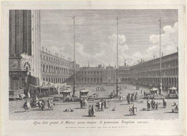 Curator: Giacomo Guardi invites us to experience 18th-century Venice in "The Piazza San Marco towards San Giacomo," likely completed between 1764 and 1835, now residing at The Met. It's rendered primarily in watercolor. Editor: Oh, this hits a certain wistful note for me. The soft watercolors create a kind of dreamy, ephemeral version of Venice. Curator: I'm drawn to how Guardi frames the spatial dynamics. Note how the drawing methodically guides us, the rigid geometry of the buildings set against a throng of figures and vendors in a bustling central scene. Editor: You know, the muted palette and the relatively small scale almost create this feeling like looking into a snow globe – Venice captured, pristine, and perhaps a bit distant from the grit of reality. There’s a lightness, a Rococo flourish even in this cityscape. It's hard not to smile a bit when imagining what sort of tales that place would have if it were able to speak. Curator: Exactly. The application of watercolor almost feels effortless. You see how that thin application results in semi-transparency which brings a hazy Venetian quality that the Rococo truly sought out. It feels casual in nature. A perfect picturesque snapshot. Editor: Looking at the human figures populating the Piazza, it feels like each of these individual little moments—the exchanges between people, the dogs weaving about—contribute to this cohesive image of the day’s unique feeling. A slice of preserved, perfect, even idealized urban existence. Curator: And I'm quite sure those people who came across it felt similar to us today. Thank you. Editor: Indeed. It's left me wanting a grand adventure of my own!