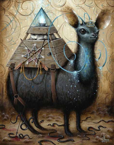 Editor: Konstantin Korobov's oil painting, "Bases", presents us with quite the striking image. I'm immediately drawn to the contrasting textures – the smooth hide of the bull juxtaposed against the almost fossilized skin of the fish-like creature. What strikes you as you view the artwork? Curator: The formal interplay between these two figures immediately suggests a hierarchy or symbiosis structured through vertical composition and variations of light and shadow. Notice how Korobov renders the forms with a stark tonal range. The chromatic intensity draws the eye towards the apex – the luminescent red gemstone above the bull. The forms suggest not merely juxtaposition but superimposition. Editor: So you’re saying the way the artist has arranged these shapes and the gradations in colour aren't just for aesthetics, but hint at a more complex relationship between these elements? What do you make of the composition choice with the bull perched on the fish-like creature? Curator: Precisely. We observe a dynamic layering, moving from the archaic fish form to the bull – terrestrial virility - culminating in the almost divine gem. It forms a pyramid-like hierarchy within the canvas. Editor: The pyramid composition definitely anchors my understanding. So it’s less about ‘what does it mean’ and more about ‘how does the structure inform its meaning’? Curator: Yes, focus on the intrinsic organization of the artwork. Korobov masterfully directs our perception through strategic distribution of form and tonality. Note the details—the ridges on the fish and how that textural component contrasts with the bull, yet also supports the composition as a whole. Editor: It definitely enriches our experience when you detach the historical context from the viewing! Thank you! Curator: The artist expertly created a visually rich and thought-provoking art experience by arranging shapes.
