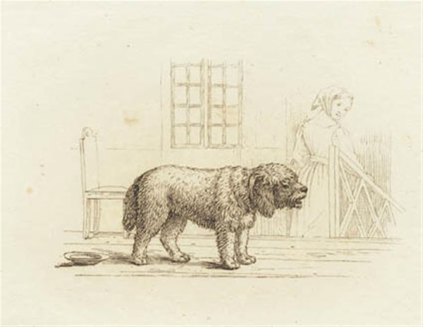 Editor: This is Martinus Rørbye’s "Illustration til 'Halvhundrede Fabler for Børn' af Hey," made in 1834. It's a drawing, pencil and engraving print of a dog and a rabbit, very sweet and simple. What do you see in this piece, that maybe I’m missing? Curator: This illustration offers a fascinating glimpse into 19th-century social dynamics through the lens of animal allegory. I’m particularly interested in how Rørbye uses the contrasting postures of the dog and the rabbit – the dog standing assertively, while the rabbit is perched on a stool, almost enthroned. Does this visual hierarchy suggest commentary on power structures within the family or society? What might the artist be saying about social mobility or inherited privilege? Editor: I hadn't considered the social commentary aspect. I just saw them as characters from a fable. Curator: Precisely! The fable itself is a vehicle for societal critique. Rørbye’s illustration enhances that, inviting us to consider the roles individuals play, whether willingly or under coercion. What kind of "lesson" could their interaction symbolize in the broader context of social and gendered expectations of the time? Editor: So, you see the relationship between the animals as representing broader issues about power, gender, and society in the 19th century? Curator: Yes, and understanding that gives a more solid foundation for our current reading of its function today. Does the image challenge the status quo? Does it perpetuate it? These are critical questions. Editor: I'll definitely look at illustrations differently from now on. I used to think of them as merely decorative. Curator: Exactly. Art, in any form, provides us insight, even illustrations meant for children!