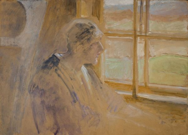 Editor: This is "Andreas Reading" by Edvard Munch, an oil painting with elements of both Impressionism and Expressionism. There's a certain quiet domesticity to it, but also an unease, almost as if the room itself is breathing. What are your initial observations of the painterly techniques? Curator: Note the impasto technique employed; the paint application isn’t just representational, it’s expressive. See how the thick strokes build a tactile surface, particularly in the walls and the curtains? How does this contribute to your perception? Editor: I see that the heavy brushstrokes give the scene movement and a kind of unrest, even to inanimate objects. Is Munch creating emotional weight solely with form? Curator: Precisely. Forget representational accuracy for a moment. Consider how the juxtaposition of the cool blues in the window contrast against the warm ochres elsewhere, destabilizing any sense of harmony. That lack of resolution is crucial to the piece. What do you make of that limited colour palette? Editor: It's interesting that you highlight disharmony as Munch typically creates harmony, it speaks to both mood and an active artistic choice that impacts how we interpret the overall sentiment. I also note how little details there are overall in terms of details, which makes the scene unsettling in its generality. Curator: An astute observation, note the interplay of lines that delineate the figure in relation to the domestic objects in the periphery; observe the brushstrokes to infer at meaning that may have been lost in translation. Editor: It makes you appreciate the artist’s choice even more as you continue analysing it. Thank you for sharing a completely different way to look at it! Curator: You are most welcome! Analysing formal elements offers potent avenues to the core essence of art.